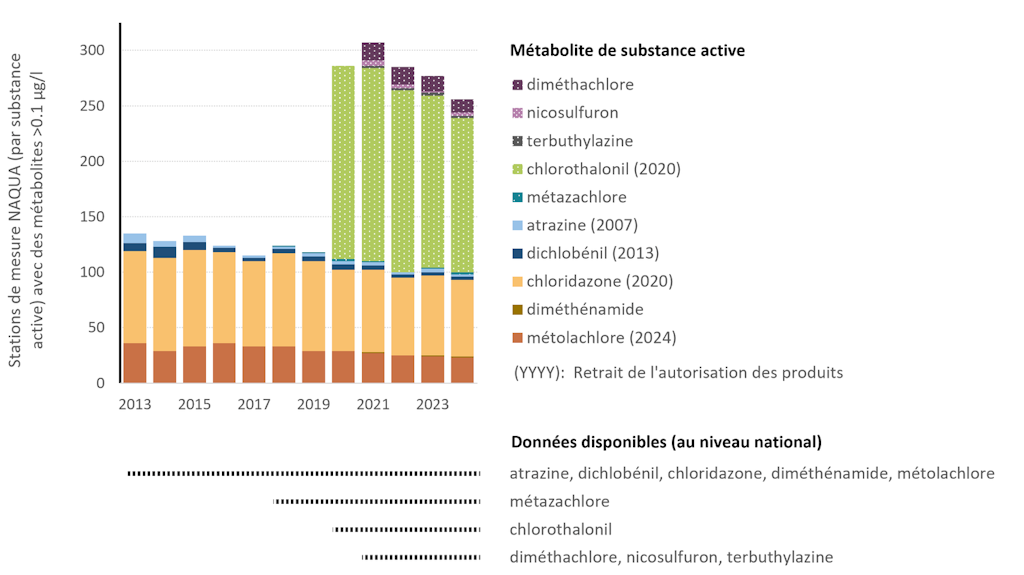 Les métabolites des herbicides chloridazone et métolachlore dépassent également de manière répétée et étendue la valeur de 0,1 μg/l. Les métabolites du chloridazon sont apparus en concentrations élevées à jusqu’à 14 % des stations de mesure par an au cours des 5 dernières années, les métabolites du métolachlore à environ 5 % des stations. L'autorisation du chloridazone a été retirée en 2020, celle du métolachlore en 2024.