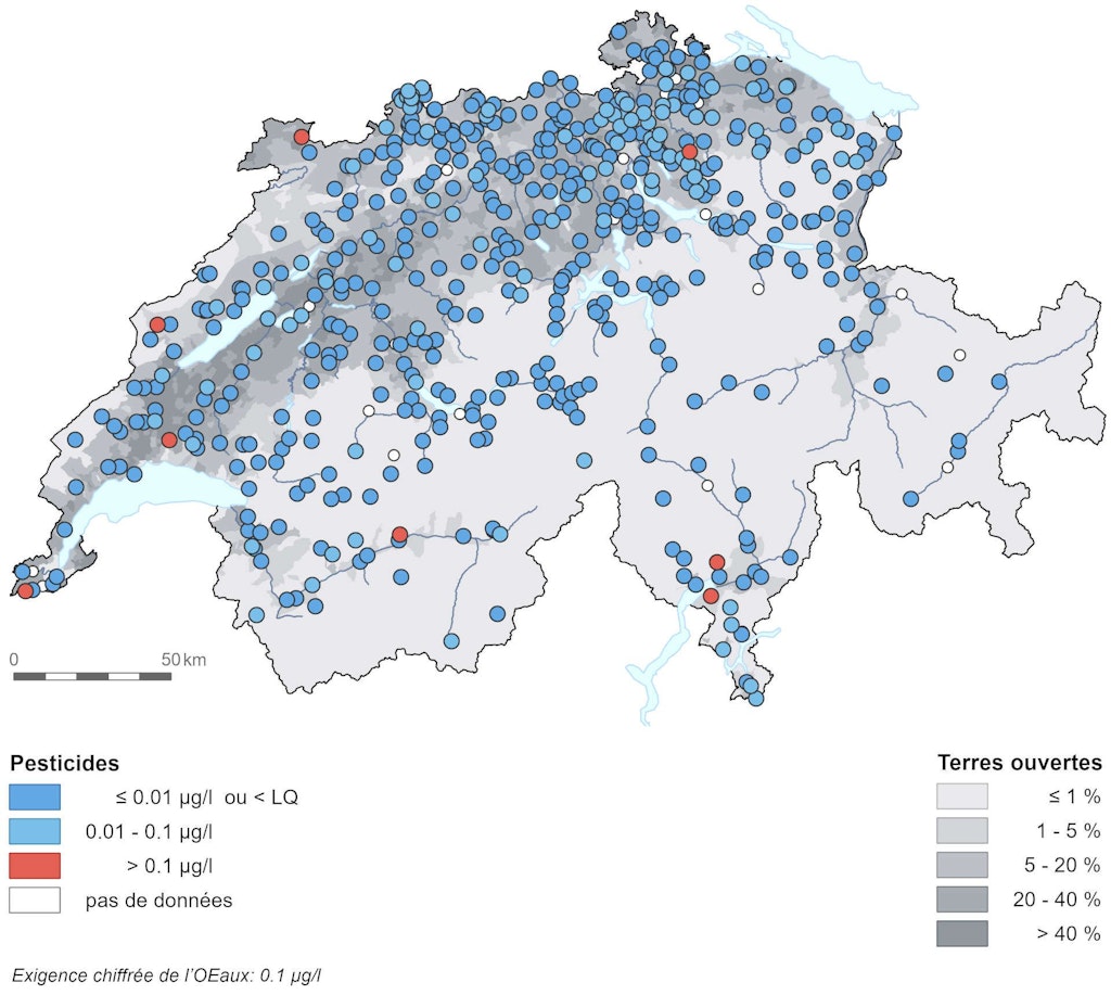 Des pesticides dépassent la valeur limite de 0,1 μg/l à 1 à 2 % des stations de mesure chaque année. En outre, un tiers des stations à l’échelle nationale détecte, dans les eaux souterraines, des produits de dégradation (métabolites) de pesticides dans des concentrations dépassant 0,1 μg/l. Ces substances portent considérablement atteinte à la qualité des eaux souterraines, en particulier sur le Plateau.
