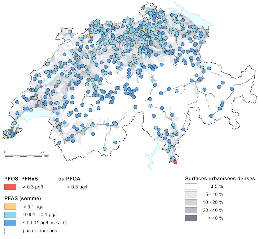 Les substances per- et polyfluoroalkylées (PFAS) sont présentes en Suisse à près de la moitié des stations de mesure de l’Observation nationale des eaux souterraines NAQUA. Les valeurs supérieures à 0,1 microgramme par litre sont souvent dues à l’utilisation de mousses fluorées dans la lutte contre les incendies dans le bassin d’alimentation en question. Les PFAS peuvent cependant parvenir dans les eaux souterraines également à partir de décharges ou par infiltration de cours d’eau.
