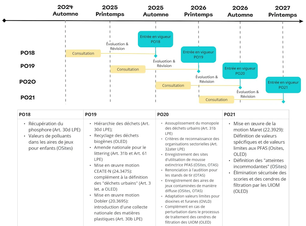 Les révisions des ordonnances correspondantes seront envoyées en consultation de manière échelonnée. La consultation portant sur les dispositions relatives au monopole sur les déchets urbains ainsi qu’au financement par les associations de branche privées est planifiée pour le printemps 2026. Il est aussi prévu de mettre en œuvre la motion Dobler 20.3695 et de créer une collecte des déchets plastiques harmonisée à l’échelle nationale, moyennant la révision de l’ordonnance sur les emballages (OEm). Les adaptations prévues dans le cadre du 19e paquet d’ordonnances environnementales devraient entrer en vigueur mi-2026, et celles 20e paquet, fin 2026.