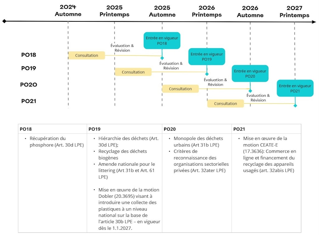 Le 13 novembre 2024, le Conseil fédéral a décidé de mettre en vigueur la majeure partie de ces nouvelles bases légales au 1er janvier 2025. Les dispositions relatives à l’abandon de déchets sur la voie publique (littering ; art. 31b, al. 7, et 61, al. 4, LPE), au monopole sur les déchets urbains (art. 31b, al. 4 à 6, LPE) et au financement par les associations de branche privées (art. 32ater LPE) entreront en vigueur en même temps que leurs dispositions d’exécution. Les révisions des ordonnances correspondantes seront envoyées en consultation de manière échelonnée.La consultation au sujet de l’introduction d’une amende pour littering uniformisée à l’échelle nationale est agendée pour la mi-2025. Celle portant sur les dispositions relatives au monopole sur les déchets urbains ainsi qu’au financement par les associations de branche privées est, quant à elle, planifiée pour la fin de l’année 2025. Il est aussi prévu de mettre en œuvre la motion 20.3695 et de créer une collecte des déchets plastiques harmonisée à l’échelle nationale, sur la base de l’actuel art. 30b LPE. La consultation relative à la révision de l’ordonnance correspondante est fixée au premier semestre 2025.