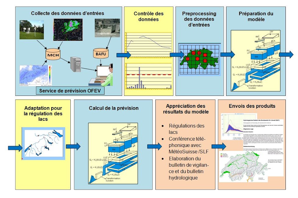 Chaque matin, l’équipe responsable calcule les nouvelles prévisions de débit, interprète les résultats obtenus et les publie. Le schéma ci-dessous et le texte qui l’accompagne décrivent ce processus.
