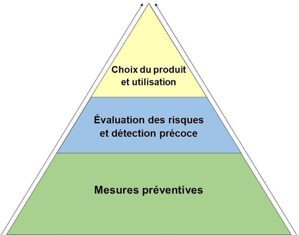 La stratégie de protection de matériaux présentée ici repose sur l’association de différentes mesures prises en fonction de la situation. Représentée sous la forme d’une pyramide à plusieurs niveaux, elle suit une approche holistique. À l’instar de la stratégie éprouvée de « protection phytosanitaire intégrée », on peut parler de « protection de matériaux intégrée ».