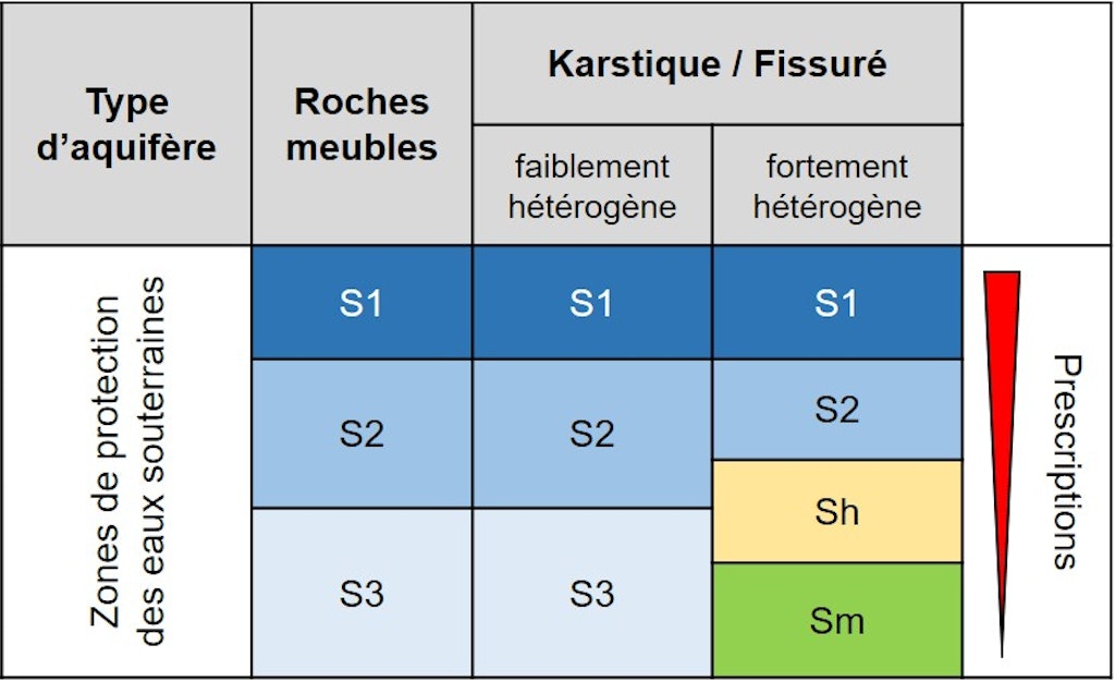 Zone de protection Sm (karst / fissure) : La zone Sm couvre les secteurs de vulnérabilité moyenne. La zone Sm protège, elle aussi, les eaux souterraines contre les apports de substances de nature à polluer les eaux et contre l’altération de leur écoulement due à des travaux de construction. Toutefois, un plus grand nombre d’installations et d’activités que dans la zone Sh sont autorisées.