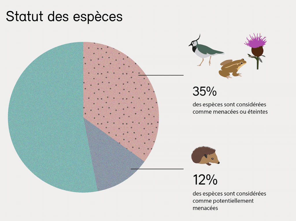 Le rapport sur l’état et l’évolution de la biodiversité en Suisse (Office fédéral de l’environnement [OFEV], 2023) ainsi que la synthèse des listes rouges (OFEV, 2023) montrent que la qualité et la mise en réseaux de nombreux milieux ne suffisent pas à conserver la biodiversité de notre pays à long terme. En Suisse, près de la moitié des 167 milieux évalués (p. ex. suintements, hauts-marais ouverts, molinaies) et 35 % des quelque 11 000 espèces d’animaux, de plantes et de champignons évalués sont considérés comme menacés ou ont disparu.