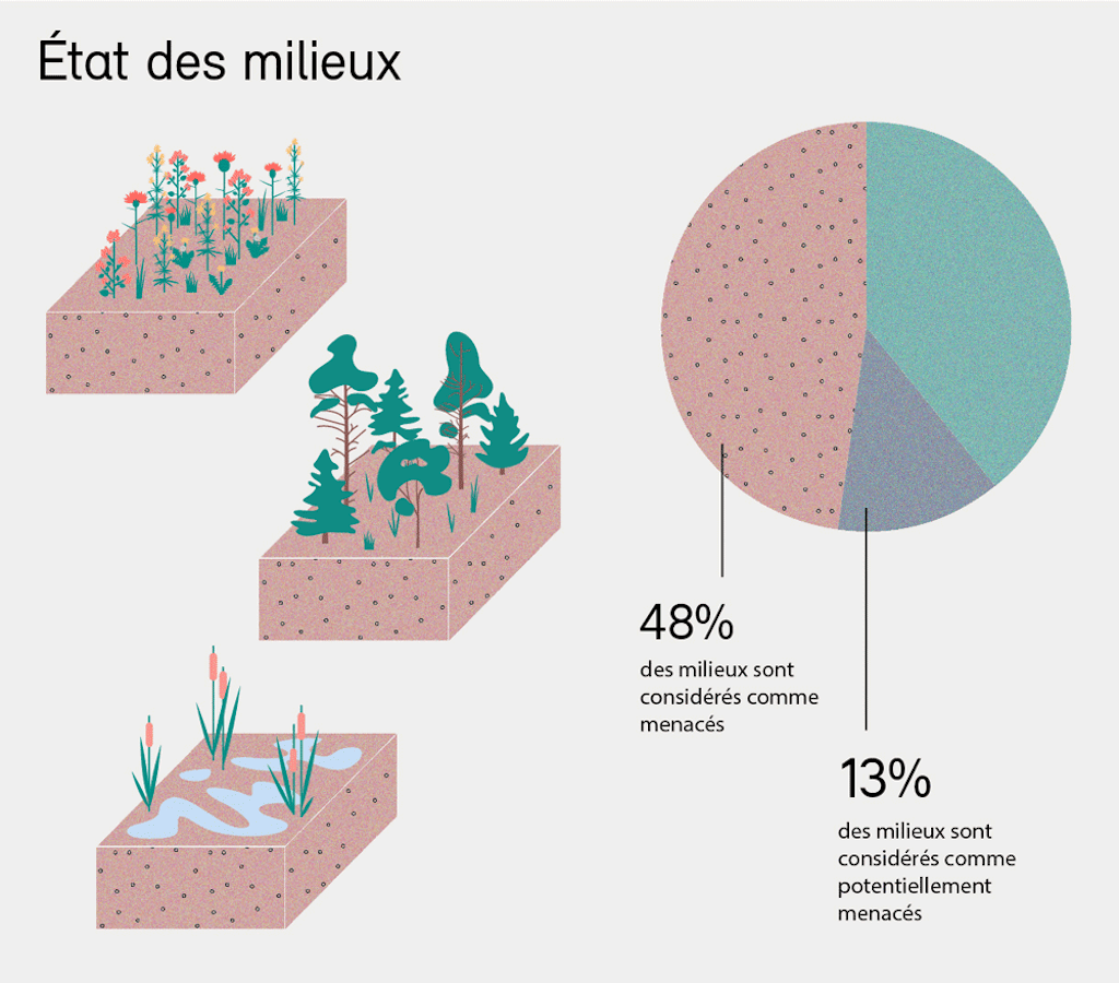 Il existe dans ce contexte un lien étroit entre qualité des milieux et mise en danger des espèces. En effet, la plupart des espèces animales, végétales et fongiques menacées sont tributaires de conditions spécifiques et peinent à s’établir dans un autre milieu. Si la qualité de leur habitat s’amenuise et que celui-ci n’est pas connecté à d’autres milieux viables, elles risquent de disparaître.