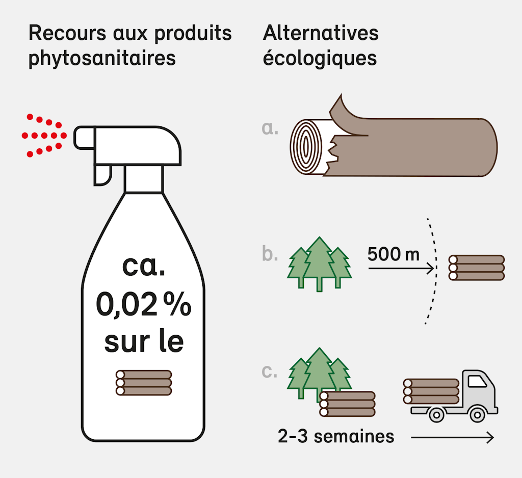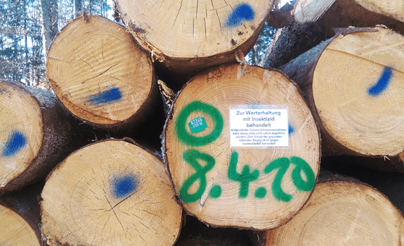 Si le bois récolté ne peut être rapidement évacué, il est parfois traité au moyen de pulvérisateurs pour éviter les infestations de coléoptères et donc une perte de valeur marchande. La loi sur les forêts interdit l’utilisation de PPh en forêt, mais des exceptions existent : elles sont réglées dans l’ordonnance sur la réduction des risques liés aux produits chimiques et doivent être autorisées par les autorités cantonales.