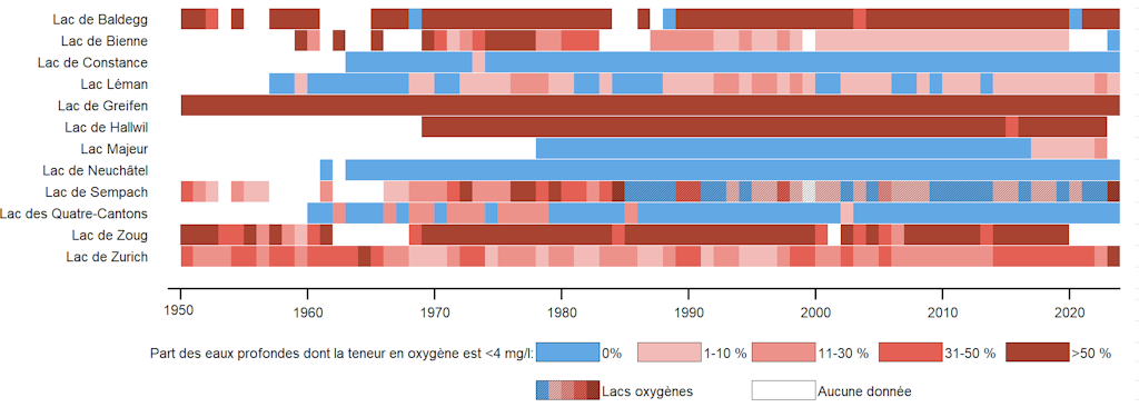 À l’heure actuelle, 60 % des grands lacs suisses n’atteignent pas le seuil de 4 milligrammes d’oxygène par litre (p. ex. lac de Greifen) ou l’atteignent seulement grâce à une oxygénation artificielle (p. ex. lac de Sempach). Bien que la qualité de l’eau se soit améliorée dans de nombreux cas suite à la réduction de la charge de phosphore, l’oxygénation tarde à se rétablir. Tel est notamment le cas du lac de Bienne, dans lequel la part des eaux profondes pauvres en oxygène a certes diminué depuis les années 1990, mais où la valeur seuil n’est toujours pas atteinte annuellement. Même dans les lacs qui sont parvenus à se rétablir, la concentration d’oxygène dans les eaux profondes pourrait de nouveau baisser à l’avenir en raison de la modification des brassages induite par les changements climatiques et plus précisément par la hausse des températures des eaux. Citons comme exemple le lac de Zurich, dans lequel la zone des eaux profondes pauvres en oxygène s’agrandit continuellement.