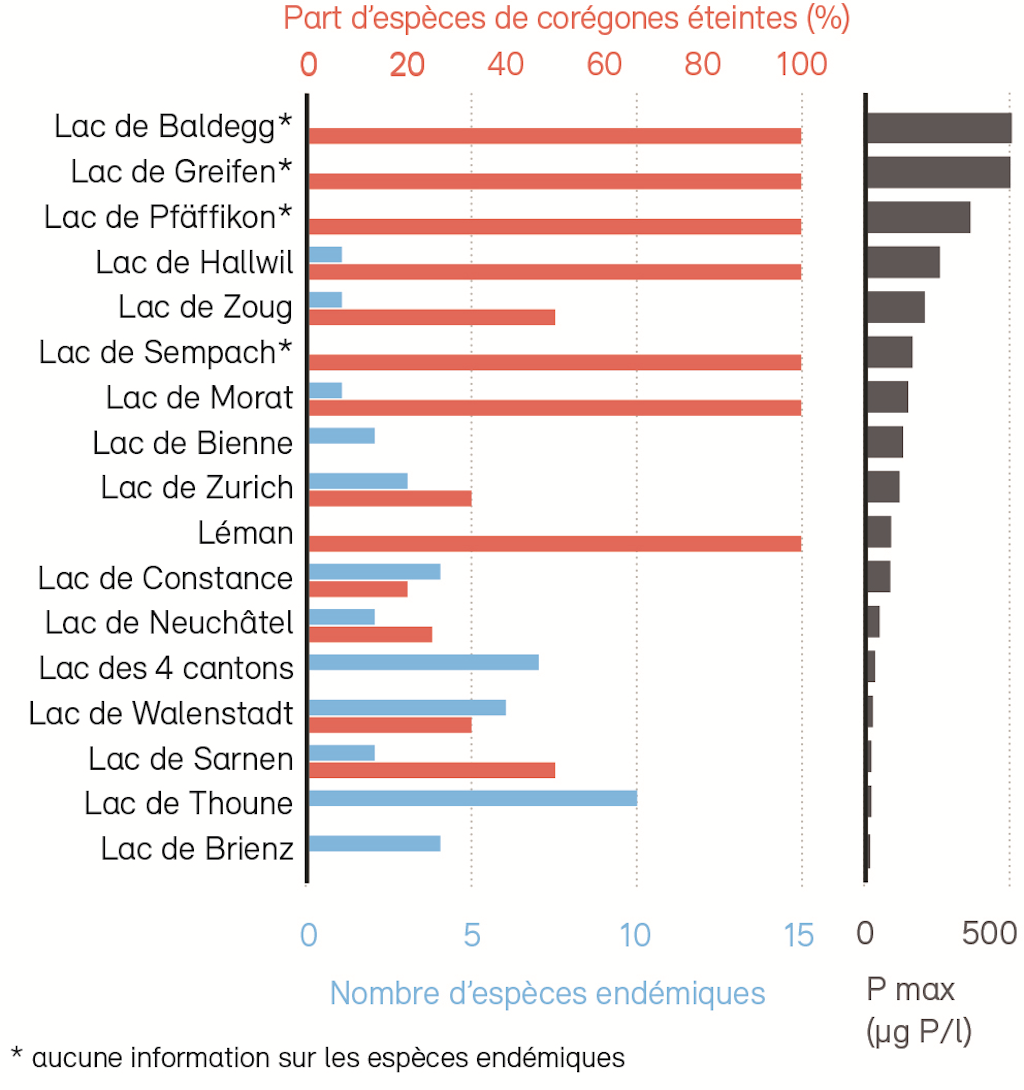 Les lacs suisses sont habités par un nombre supérieur à la moyenne d’espèces de poissons endémiques, dont l’aire de répartition est très petite. Pendant la période de surfertilisation, la pénurie d’oxygène dans le fond des lacs a entraîné la disparition fréquente de poissons qui s’étaient adaptés à la vie en eaux profondes, notamment diverses espèces de corégones. Aujourd’hui, seules les eaux profondes des lacs n’ayant jamais été exposés à la surfertilisation, comme les lacs de Brienz, de Thoune et de Walenstadt, abritent encore de nombreuses espèces de corégones et d’ombles.