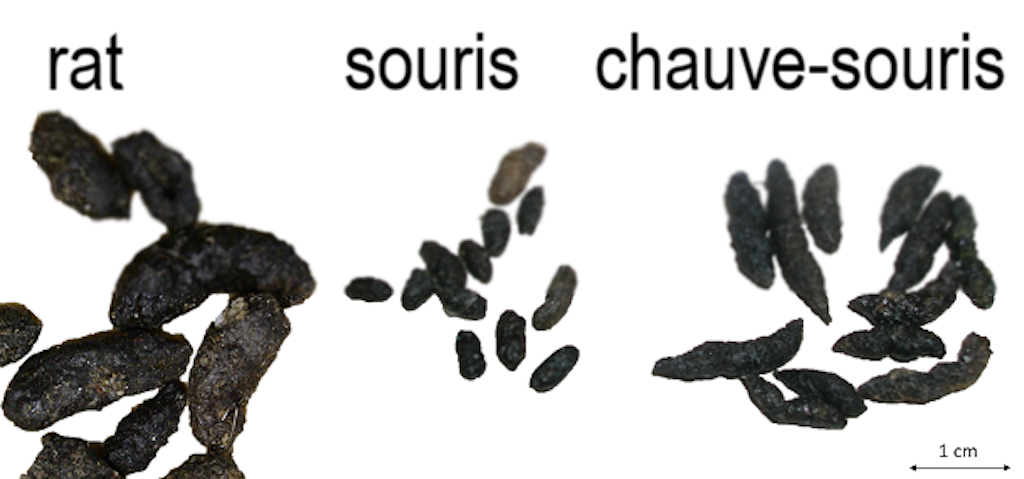 - Excréments : partout où elle passe et s’arrête, la souris laisse des excréments qui ont une forme de graine et qui peuvent atteindre une longueur de 8 mm environ. Les excréments des rats sont soit un ensemble rapproché de formes fuselées mesurant 2 ou 3 cm de long (rat surmulot), soit un ensemble dispersé de formes en bananes de 1 ou 2 cm (rat noir). La quantité de petits tas d’excréments peut donner une indication sur le nombre de rongeurs. Un rat produit une quarantaine de déjections par jour, contre 60 à 100 pour la souris. Une crotte molle et brillante est fraîche, tandis qu’elle est plus ancienne si elle est sèche. La présence de petits et de plus grands tas indique que les rongeurs se reproduisent à cet endroit.