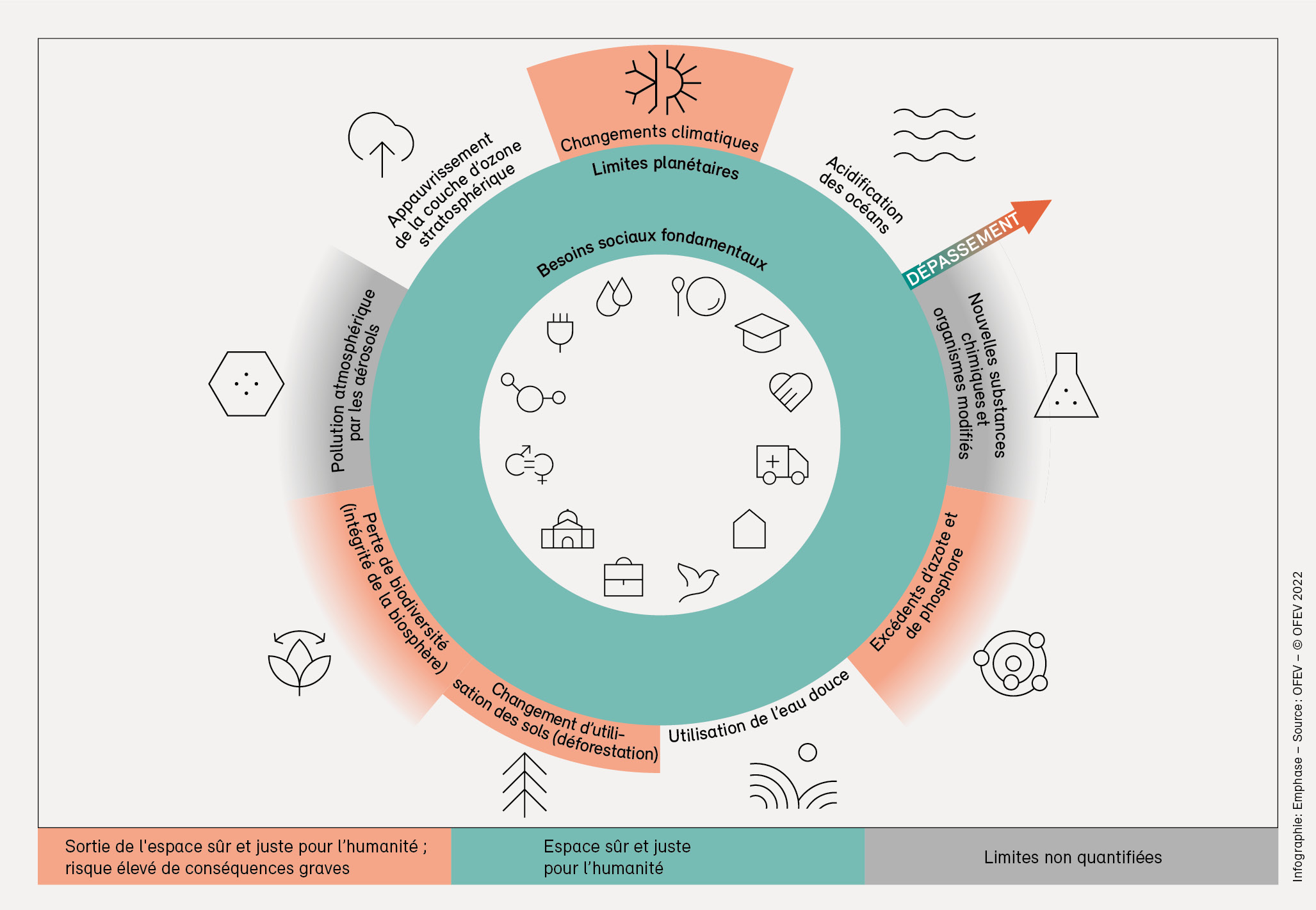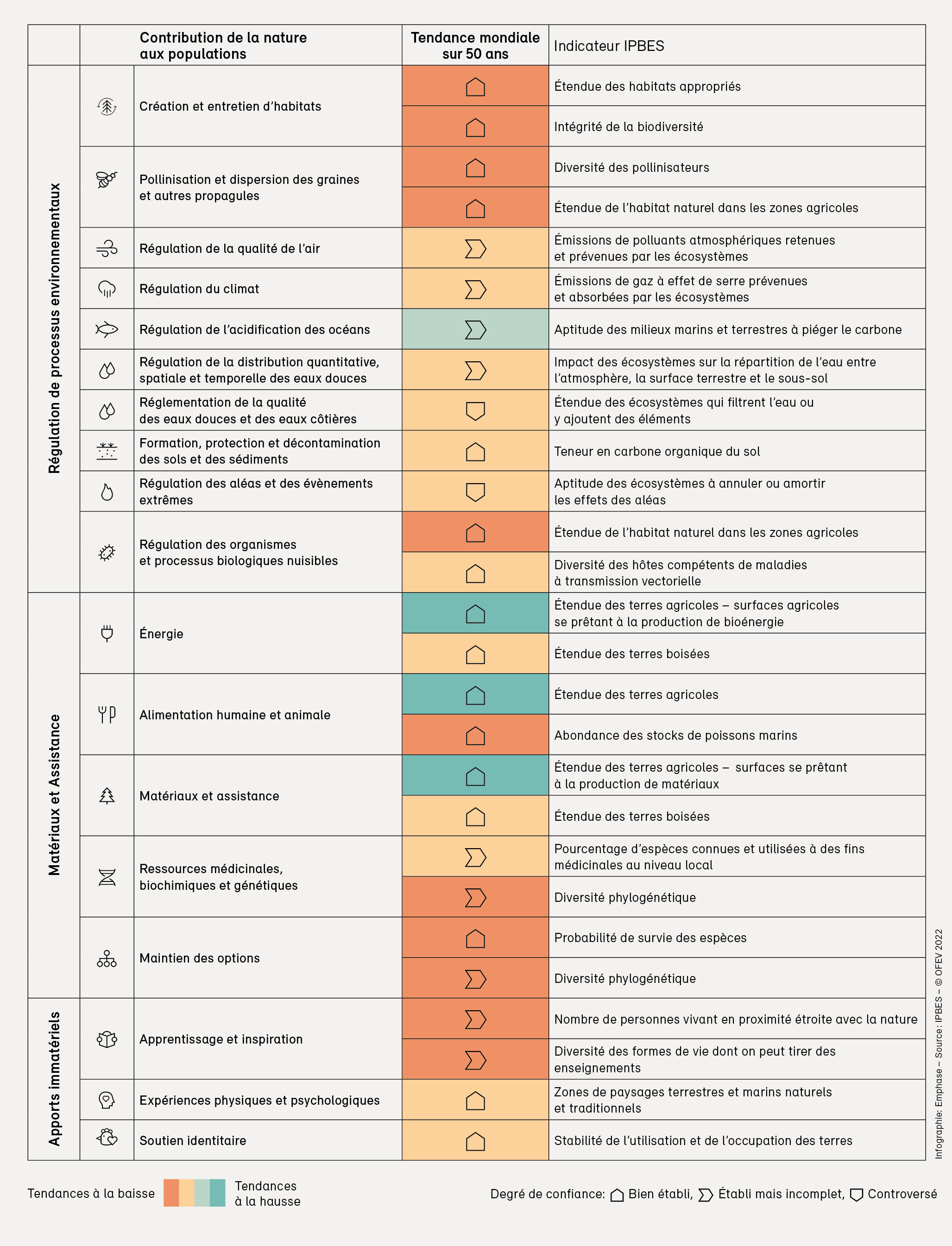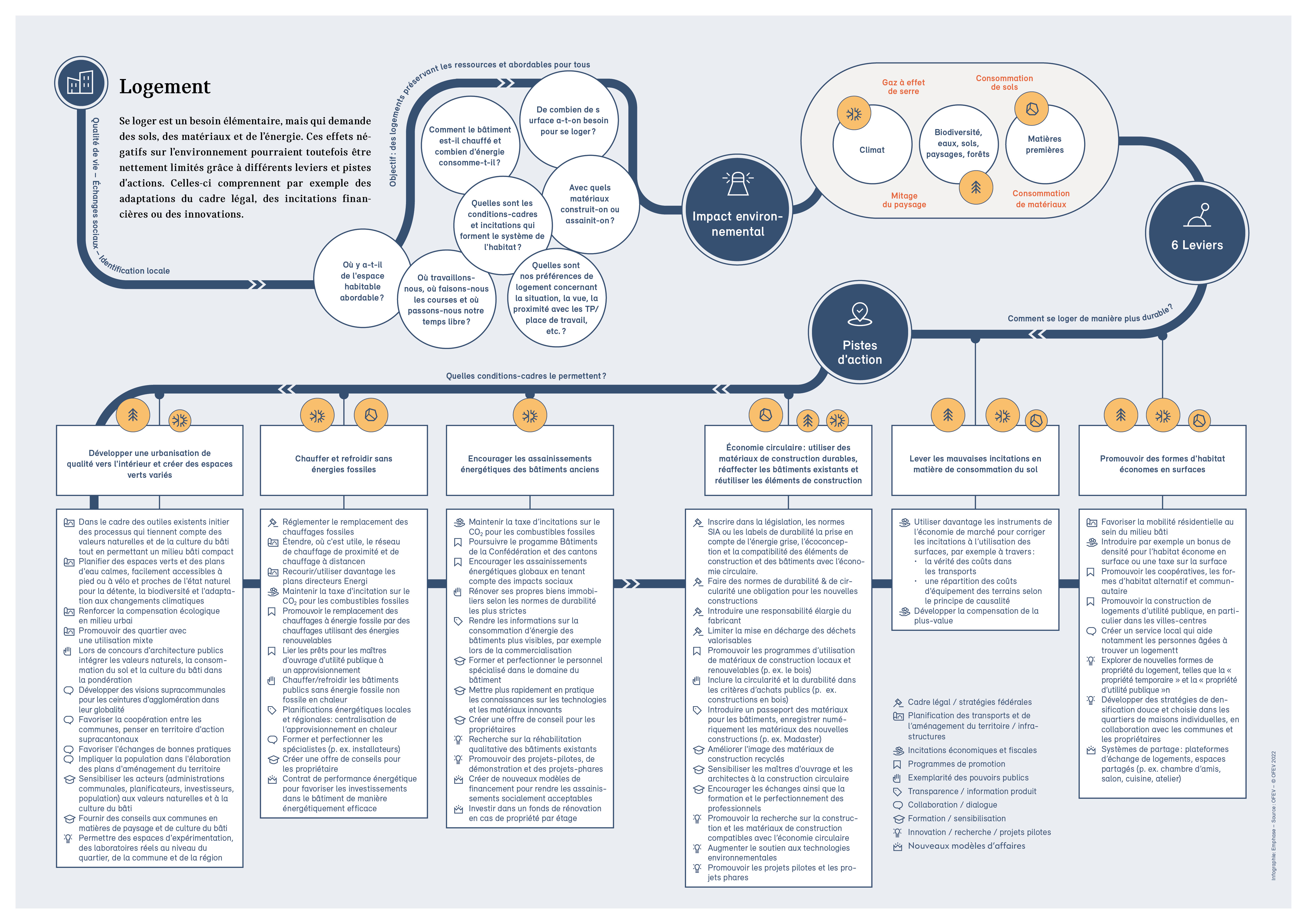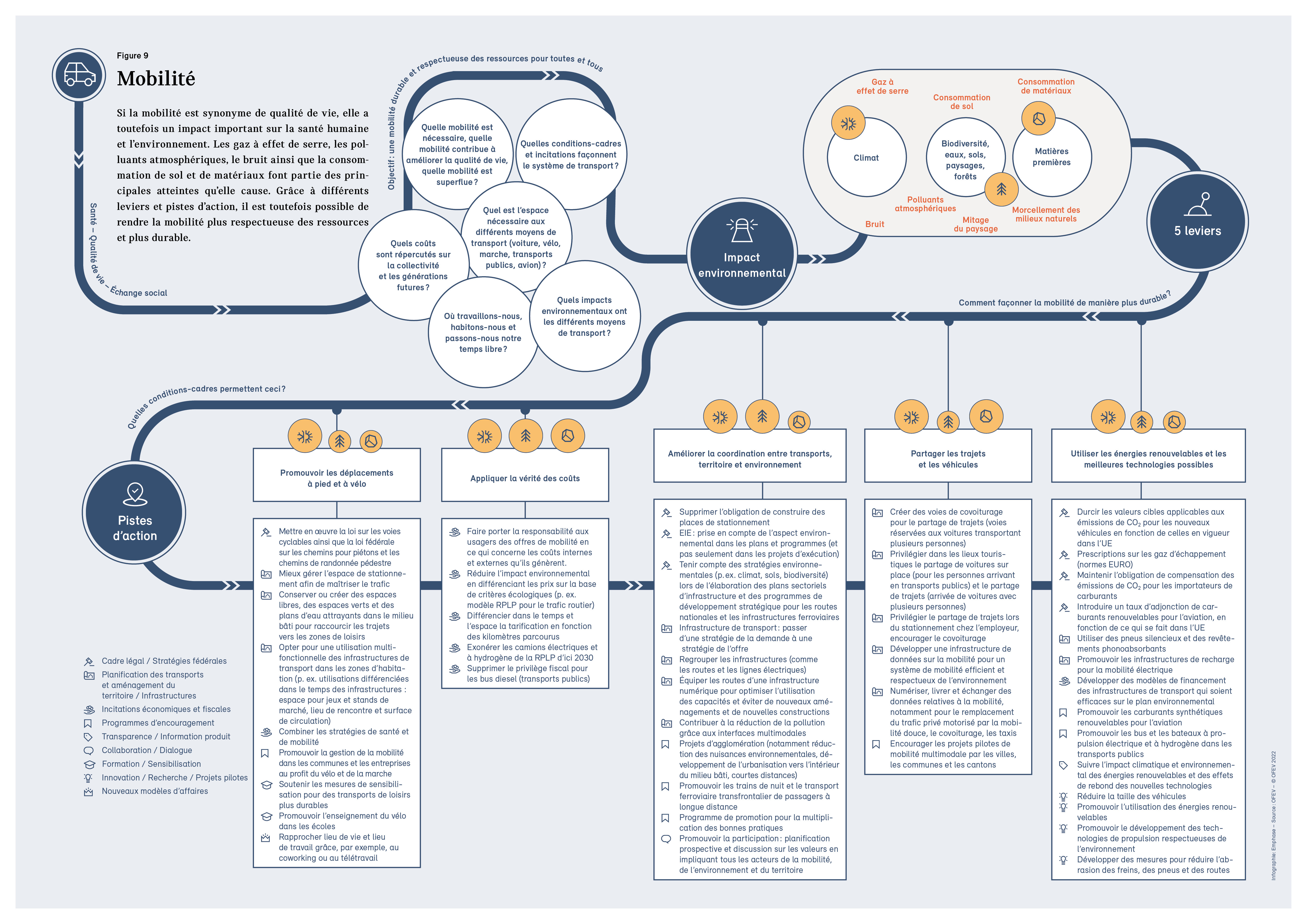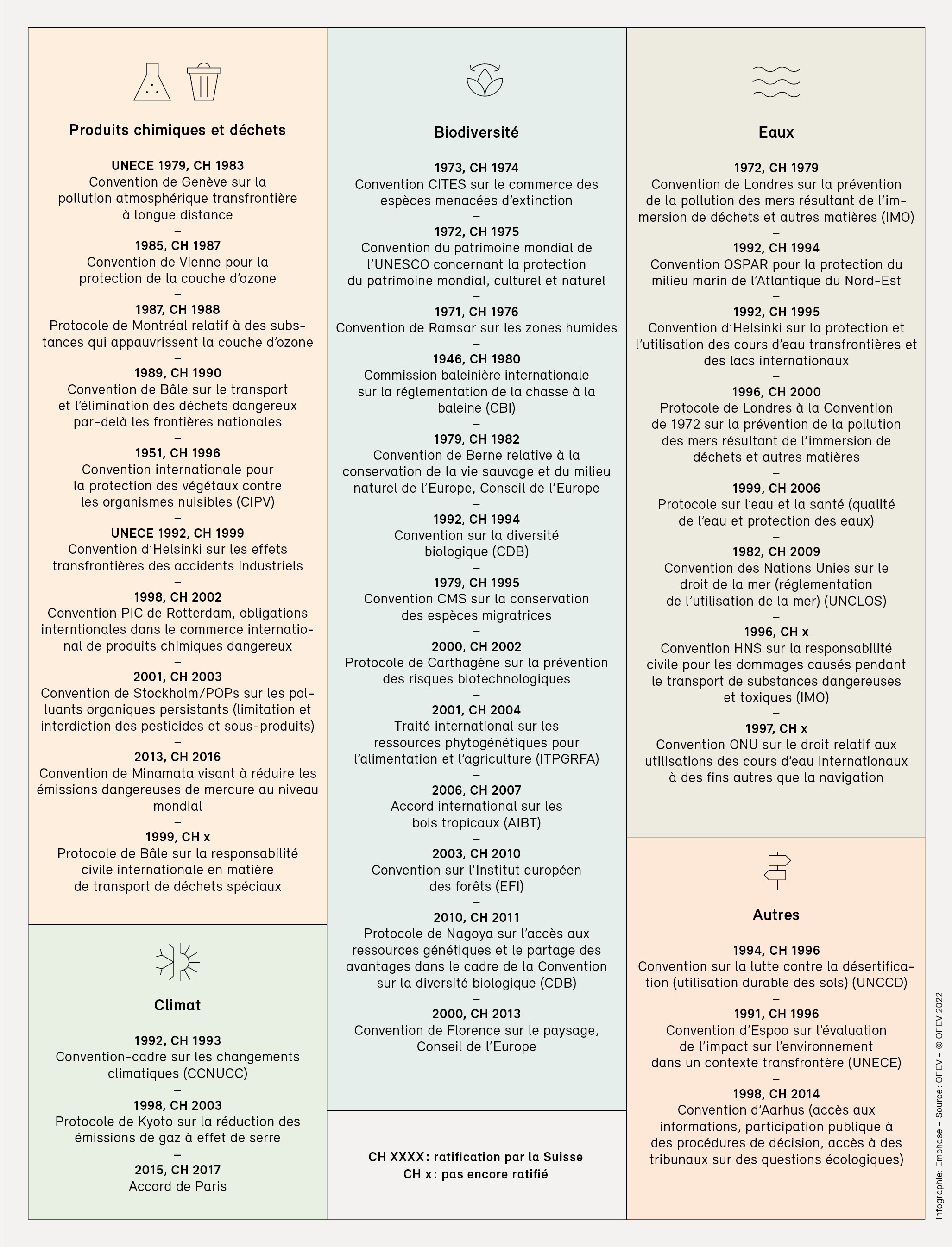 En publiant tous les quatre ans le rapport «Environnement Suisse», le Conseil fédéral satisfait au devoir légal d’information prévu à l’art. 10f de la LPE. La présente édition, «Environnement Suisse 2022», donne un aperçu de l’état et de l’évolution de l’environnement en Suisse ainsi que des atteintes environnementales causées par la Suisse. Il dresse le bilan des mesures prises par la Confédération pour améliorer la qualité de l’environnement et pointe les domaines dans lesquels des efforts supplémentaires sont nécessaires.
