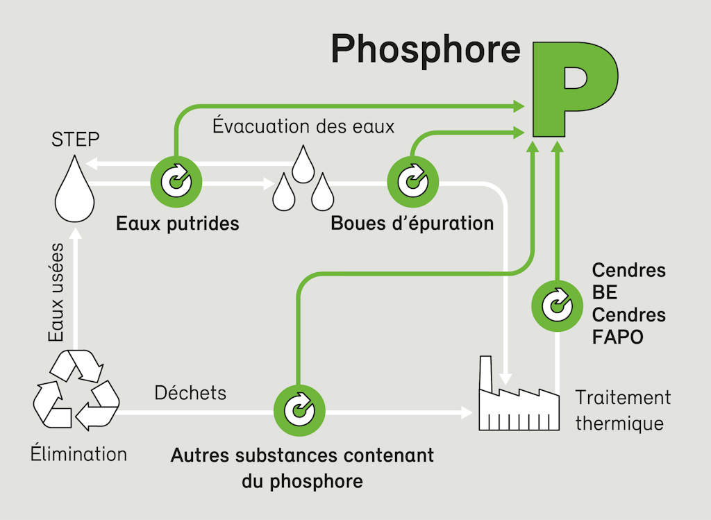 À la suite de la révision de la loi sur la protection de l’environnement (LPE ; RS 814.01) et de l’ordonnance sur les déchets (OLED ; RS 814.600), le phosphore contenu dans les boues d’épuration ainsi que dans les farines animales et les poudres d’os devra être récupéré et faire l’objet d’une valorisation matière, par exemple sous forme d’engrais. Ainsi, le secteur de l’agriculture sera à même de couvrir ses besoins avec une ressource indigène, sans qu’il soit nécessaire d’importer des engrais minéraux d’origine critiquable et contenant des métaux lourds nocifs. Cette valorisation permet en outre de boucler un cycle de matières primordial et de ménager les réserves primaires de phosphates.