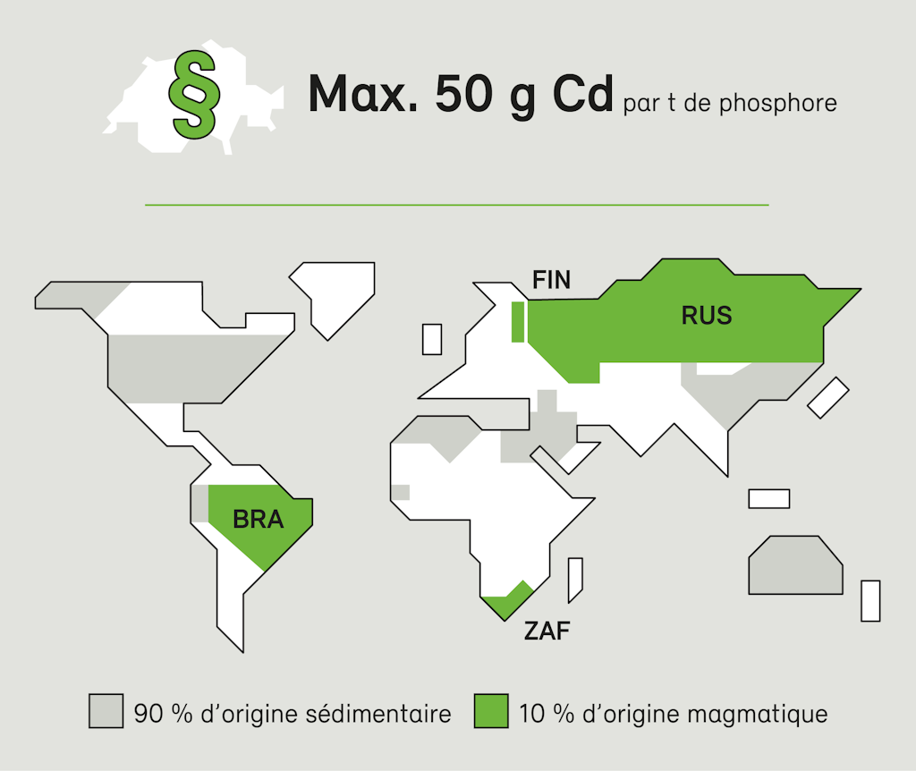 En outre, les valeurs limites strictes pour le cadmium exacerbent la dépendance aux importations. Si les gisements de minerais phosphatés d’origine sédimentaire ont une concentration de phosphate plus élevée que ceux d’origine magmatique, ils affichent également une teneur accrue en polluants tels que le cadmium et l’uranium. La Suisse a fixé des valeurs limites très strictes s’agissant des concentrations de métaux lourds dans les engrais minéraux et s’approvisionne donc principalement en minerais phosphatés d’origine magmatique qui contiennent peu de cadmium. En conséquence, elle ne peut acquérir du phosphore à des fins de production d’engrais qu’auprès de quelques mines seulement. Aussi la Suisse importait-elle jusqu’à présent beaucoup d’engrais minéraux phosphorés de Russie. Cependant, la guerre en Ukraine a changé la donne, soulignant encore une fois à quel point il est essentiel et actuel pour la Suisse de devenir moins dépendante du phosphore importé.