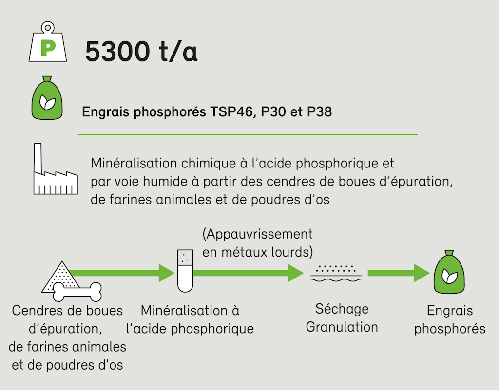 Une valorisation matière est prescrite pour le phosphore contenu dans les boues d’épuration des stations centrales d’épuration des eaux ainsi que dans les farines animales et les poudres d’os si celles-ci ne sont pas utilisées comme fourrage ou comme engrais. Le phosphore récupéré doit servir à la fabrication de produits commercialisables tels que de l’engrais ou de l’acide phosphorique.