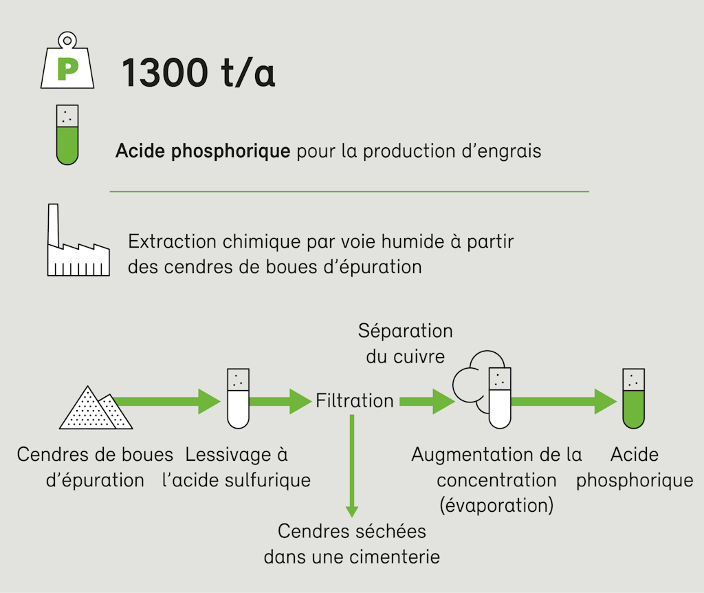 Dans le cadre du projet « Phosphor26 », il est prévu de construire sur le site de l’association « Entsorgung Region Zofingen » (erzo), à Oftringen (AG) et avec le concours de l’entreprise Holcim, une installation de séchage des boues d’épuration ainsi qu’une installation d’envergure utilisant le procédé REALphos. Les partenaires du projet sont erzo (AG), l’installation d’incinération de boues REAL (canton de Lucerne) et Holcim. Le procédé REALphos de blanchiment des cendres consiste à produire un acide phosphorique fertilisant au moyen d’une méthode d’extraction chimique par voie humide à partir des cendres de boues d’épuration. L’association ZAB, à Bazenheid, doit ensuite transformer cet acide phosphorique fertilisant en engrais phosphoré. D’après le projet actuel, l’installation prévue permettra de récupérer environ 1300 t de phosphore par an. La décision d’investissement lancera le début des travaux, pour une mise en service environ trois ans et demi plus tard.