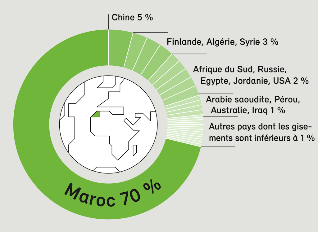 Dans la nature, le phosphore (P) existe presque exclusivement sous forme liée, à savoir de phosphate (P2O5). Ce dernier est extrait de roches phosphatées (minerais phosphatés), qui se sont principalement formées à partir de sédiments marins. Accessoirement, on trouve aussi des minerais phosphatés dans des roches magmatiques. Si la disponibilité des gisements de minerais phosphatés est assurée à moyen terme, ceux-ci se concentrent dans quelques régions caractérisées par leur instabilité géopolitique (p. ex. Maroc, Chine et Russie). Selon les régions, l’extraction des phosphates a également des effets négatifs graves pour l’être humain et l’environnement.