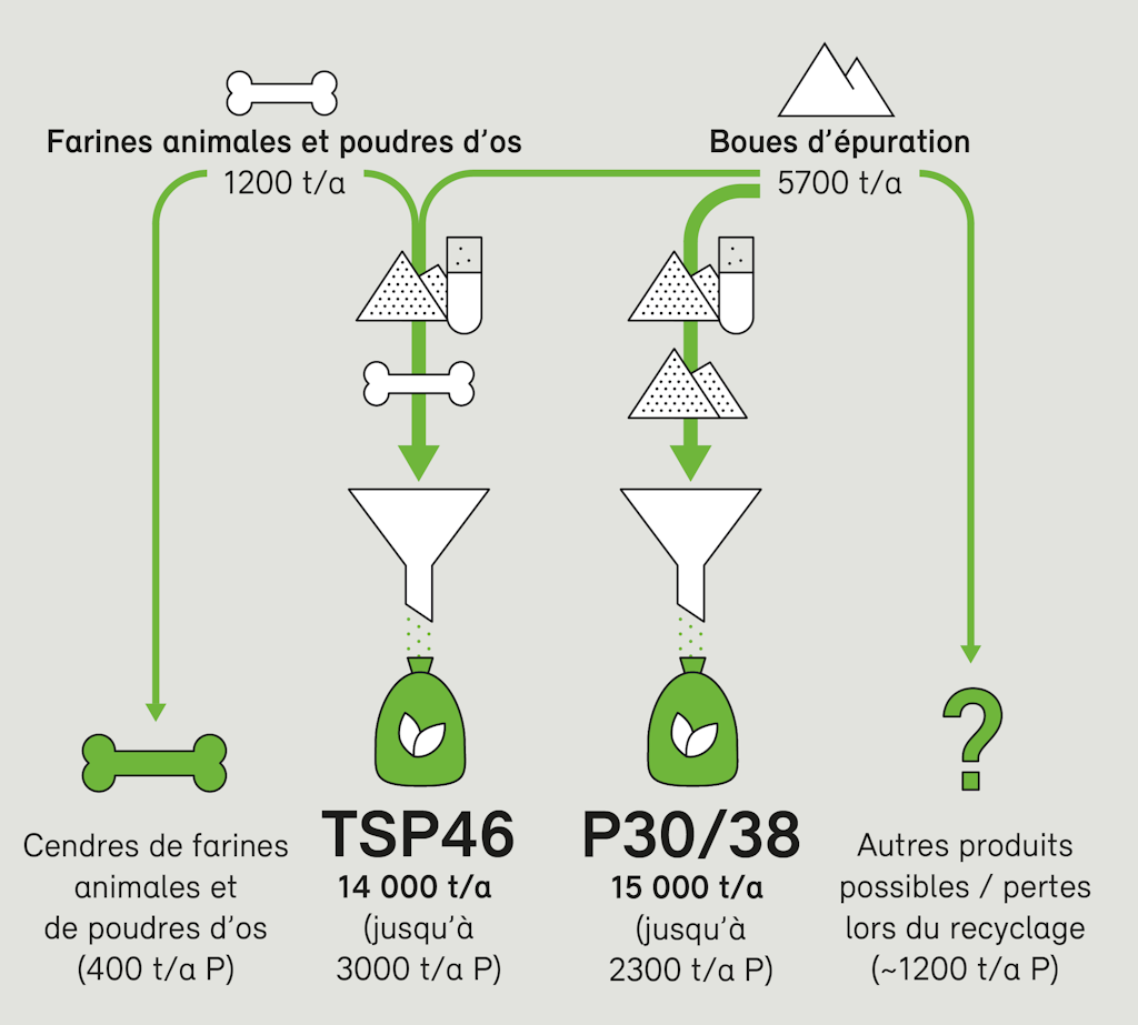 Les principaux produits fabriqués à partir du phosphore récupéré sont l’acide phosphorique de différentes qualités ainsi que les engrais P30, P38 ou TSP46. L’acide phosphorique technique peut être utilisé dans l’industrie chimique et technique ou pour la production d’engrais TSP46. L’acide phosphorique fertilisant sert à la fabrication d’engrais P30 ou P38. Tous les engrais mentionnés (P30, P38, TSP46) respectent les exigences légales et peuvent être utilisés dans l’agriculture suisse. Cependant, les engrais P30 et P38 ne répondent pas aux exigences en vigueur du secteur suisse des engrais, raison pour laquelle ils sont actuellement destinés à l’exportation. L’engrais TSP46 y satisfait et peut donc être vendu sur le marché suisse. Si les trois installations prévues, à savoir Phos4Life, Phosphor26 et ZAB, ont les capacités pour récupérer le phosphore à partir de grandes quantités de cendres de boues d’épuration, elles ne sont pas en mesure d’exploiter tout le potentiel de phosphore des boues d’épuration. D’une part, certains partenaires sont impliqués dans plusieurs projets. D’autre part, les modalités et le site de récupération du phosphore ne sont pas encore définis dans de nombreux cantons.