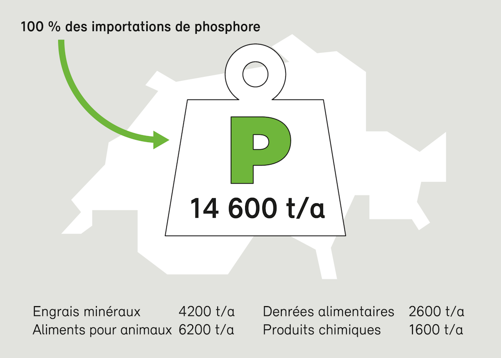 Chaque année, la Suisse importe 14 600 t nettes de phosphore via les engrais minéraux (4200 t), les aliments pour animaux (6200 t), les denrées alimentaires (2600 t) et les produits chimiques (1600 t). Comme il n’existe pas de réserves primaires de phosphore (minerais phosphatés) en Suisse, seules les importations permettent de couvrir les besoins en phosphore, notamment en engrais phosphorés. Or cette dépendance est problématique. L’épandage direct, à des fins de fertilisation, de boues d’épuration contenant du phosphore est interdit dans l’agriculture depuis 2006. Cette règle empêche les polluants de contaminer le sol, mais elle casse le cycle du phosphore dans l’agriculture.