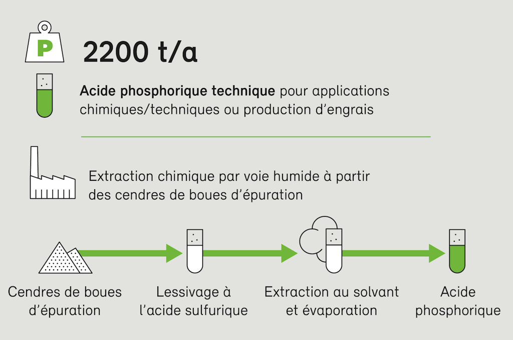 Il est prévu d’aménager sur le site de l’usine d’incinération des ordures ménagères KEBAG et de l’association « Zweckverband der Abwasserregion Solothurn-Emme » (ZASE), à Zuchwil (canton de Soleure), une installation d’envergure utilisant le procédé Phos4Life (P4L). Les partenaires du projet sont la fondation « Stiftung Zentrum für nachhaltige Abfall- und Ressourcennuzung », les installations d’incinération de boues acr (canton du Tessin), ERZ (canton de Zurich), Epura (canton de Vaud), erzo (canton d’Argovie), REAL (canton de Lucerne), saidef (canton de Fribourg), les Services industriels de Genève (canton de Genève) et ZASE (canton de Soleure). Des cendres de boues d’épuration, l’installation extrait, par voie chimique humide, un acide phosphorique technique de haute qualité, qui peut être directement commercialisé dans l’industrie chimique et technique tant en Suisse qu’en Europe. De plus, l’acide phosphorique technique peut servir à la fabrication d’engrais peu polluants, comme le TSP46, en Suisse. D’après le projet actuel, cette installation permettra de récupérer environ 2200 t de phosphore par an. Les travaux de construction devraient démarrer à la mi-2027 pour une mise en service en 2030.