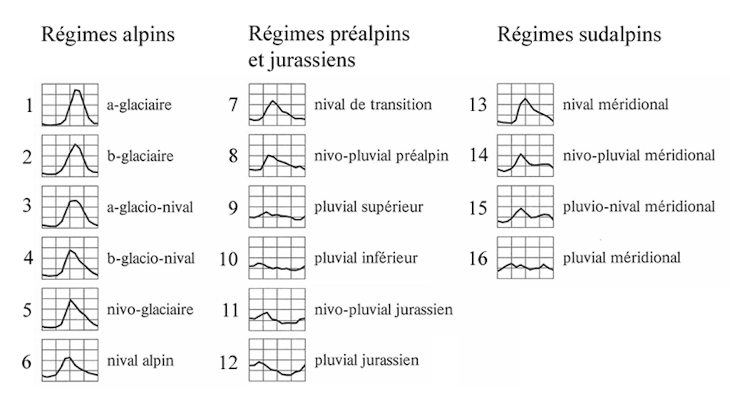- Régime alpin: un seul pic par an, bassin versant au dessus de 1550 m d'altitude.