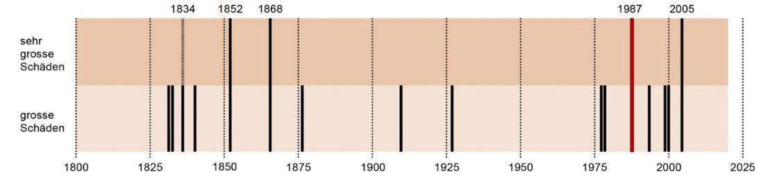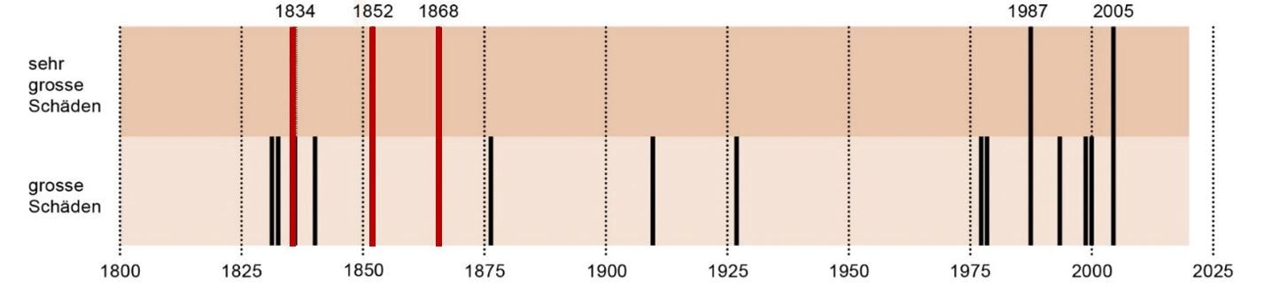 Vers l’année de fondation de la Suisse actuelle (1848), trois événements causent de très importants dommages : en 1834, en 1852 et en 1868.