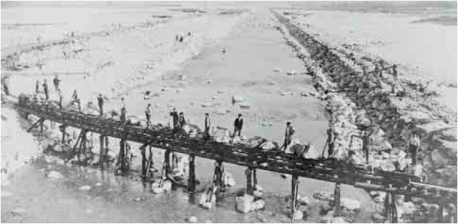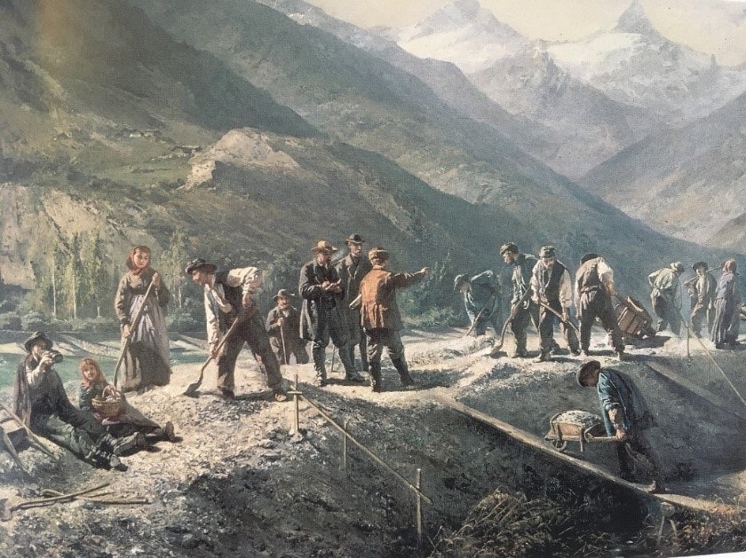 La première grande correction du Rhône, à Rarogne, a lieu en 1888. Elle consiste principalement à construire des digues de protection contre les crues ainsi que des épis. Le tableau montre les moyens rudimentaires avec lesquels les travaux étaient effectués à l’époque.