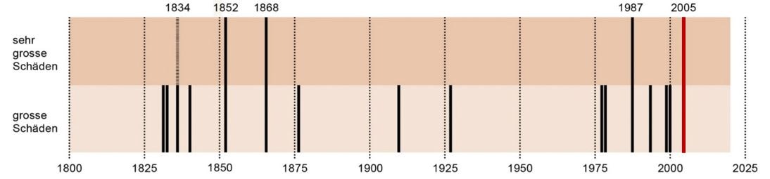 Les crues de 2005 ocasionnent à nouveau des dégâts colossaux : six personnes perdent la vie, et les coûts atteignent un montant record de trois milliards de francs.