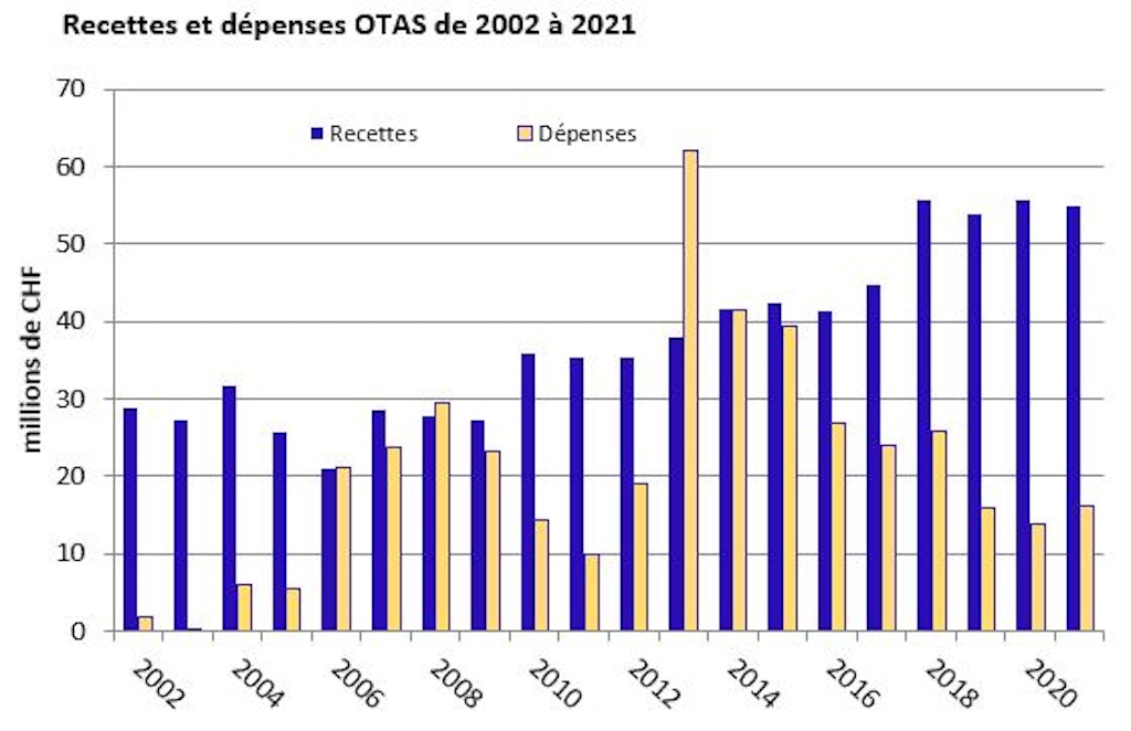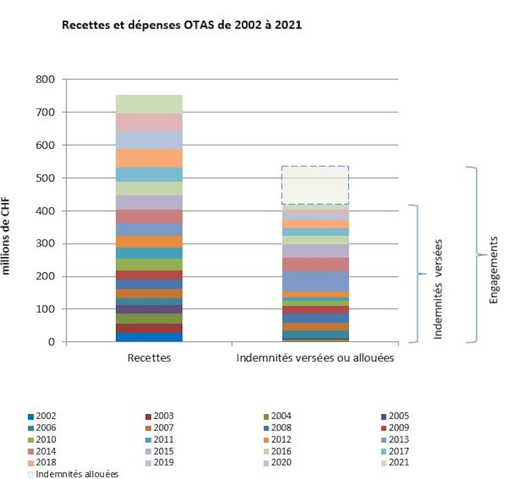 Les indemnités versées de 2002 à 2021 s’élèvent à 420 millions de francs et les indemnités allouées à 116 millions de francs. La différence entre ces engagements (536 millions) et les recettes cumulées (753 millions) se monte (virtuellement) à 217 millions de francs au 31 décembre 2021 (cf. fig. 3).