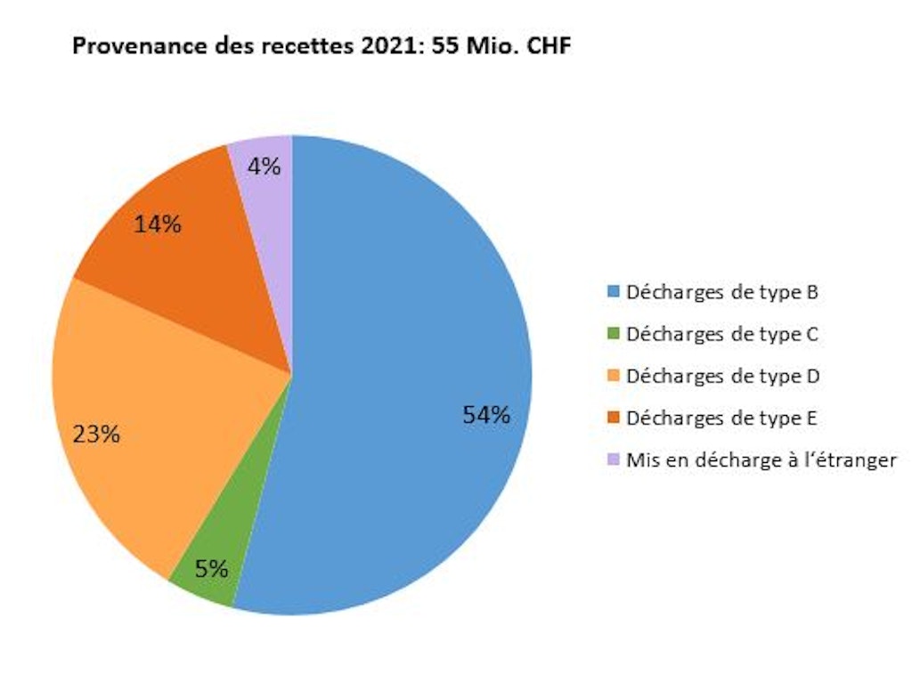 Par rapport à 2020, où elles s'élevaient à 55,8 millions de francs, les recettes ont légèrement diminué de 1,5 % (0,8 million de francs) en 2021, pour atteindre 54,99 millions de francs. L'évolution des recettes pour les différents types de décharges montre une augmentation marquée pour les décharges de type D (résidus d'incinération) et une légère augmentation pour les décharges de type C (déchets inorganiques contenant des métaux résiduels). Ces chiffres sont à mettre en parallèle avec une diminution significative du type E (déchets contenant du carbone résiduel réactif) et une légère diminution du type B (principalement des déchets de construction). Les recettes des mises en décharge à l'étranger en 2021 sont identiques à celles de l'année précédente.