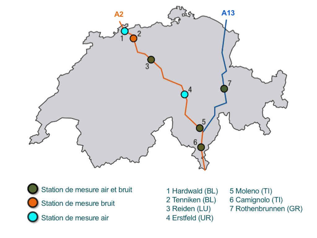 Depuis 2004, aucune augmentation - ni diminution - importante du bruit routier diurne (entre 6h et 22h selon l'ordonnance sur la protection contre le bruit) n'a été enregistrée à Reiden, ainsi que sur l'A2 et sur l'A13. Dans les autres stations un revêtement peu bruyant a été installé au minimum une fois depuis le début des mesures (à Moleno l’ancien revêtement a été remplacé par un revêtement normal). Ainsi, les émissions sonores ont pu être réduites efficacement à 4 décibels.
