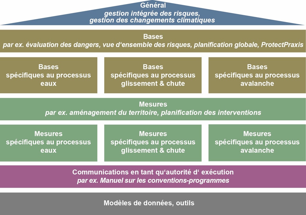 En parallèle de la révision de la loi fédérale sur l’aménagement des cours d’eau et de l'ordonnance sur l’aménagement des cours d’eau, ainsi qu'aux adaptations de la loi sur les forêts et de l'ordonnance sur les forêts, les aides à l'exécution existantes et les publications d’accompagnement dans le domaine des danger naturels sont mises à jour, complétées si nécessaire, et intégrées dans une structure modulaire.