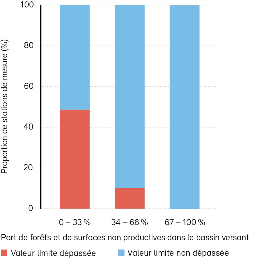 Les plus hautes concentrations de nutriments sont relevées là où ces substances parviennent en quantité dans les cours d’eau via les STEP ou les activités agricoles. Les résultats de l’Observation nationale de la qualité des eaux de surface (NAWA) en témoignent : moins un bassin versant compte de surfaces boisées et de surfaces non productives – et donc plus la part de surfaces urbanisées ou exploitées de manière intensive est élevée –plus les concentrations de substances nutritives sont importantes. Les nutriments étant moins dilués dans les petits cours d’eau, il faut s’attendre à ce qu’ils subissent des atteintes plus graves que ceux de plus grande taille.