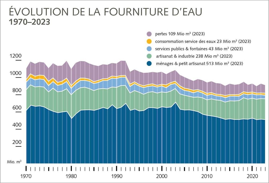Dans le cadre de l’approvisionnement public en eau, l’eau potable est fournie aux ménages, à l’industrie et à l’artisanat. L’Association pour l’eau, le gaz et la chaleur (SVGW) effectue chaque année des relevés de données et des extrapolations sur l’approvisionnement public en eau en Suisse. En 2021, l’approvisionnement public a fourni 914 millions de m3 d’eau (OFS 2023). Même si la consommation a légèrement augmenté ces dernières années après une baisse constante depuis les années 1990, on s’attend à une demande relativement stable à l’avenir selon les prévisions actuelles de consommation. L’élément critique pour les réseaux d’approvisionnement, ce sont les pics de consommation pendant les périodes de sécheresse et de canicule, qui surchargent l’infrastructure.
