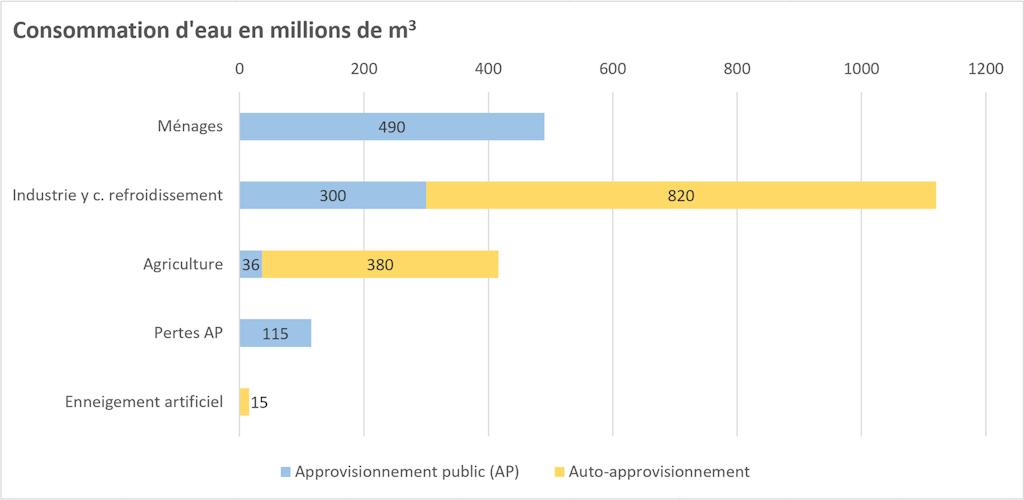 En ce qui concerne le volume d’eau consommé par l’industrie, l’artisanat et le secteur tertiaire par le biais d’un auto-approvisionnement, nous disposons seulement d’un relevé unique et d’extrapolations pour l’année 2006. En 2006, la consommation d’eau s’élevait à 1120 millions de m3. Deux tiers étaient utilisés à des fins de refroidissement et de climatisation. À cela s’ajoute la quantité d’eau nécessaire au refroidissement par écoulement des centrales nucléaires, qui représente environ 1600 millions de m3 par an.
