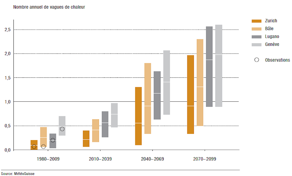 Pendant la période 1980–2009, des vagues de chaleur de sept jours consécutifs (températures maximales supérieures à 30 °C) se produisaient environ tous les dix ans à Zurich et à Bâle, tous les cinq ans à Lugano et tous les deux ans à Genève. Les changements climatiques induiront une nette augmentation de la fréquence de ce type d’épisodes. Pendant la période 2010–2039 déjà, de telles périodes de canicule se produiront jusqu’à trois fois plus souvent dans les villes précitées. Au milieu du siècle, les villes de Lugano, de Bâle et de Genève devraient même en connaître une par année en moyenne, et celle de Zurich une tous les deux ans.