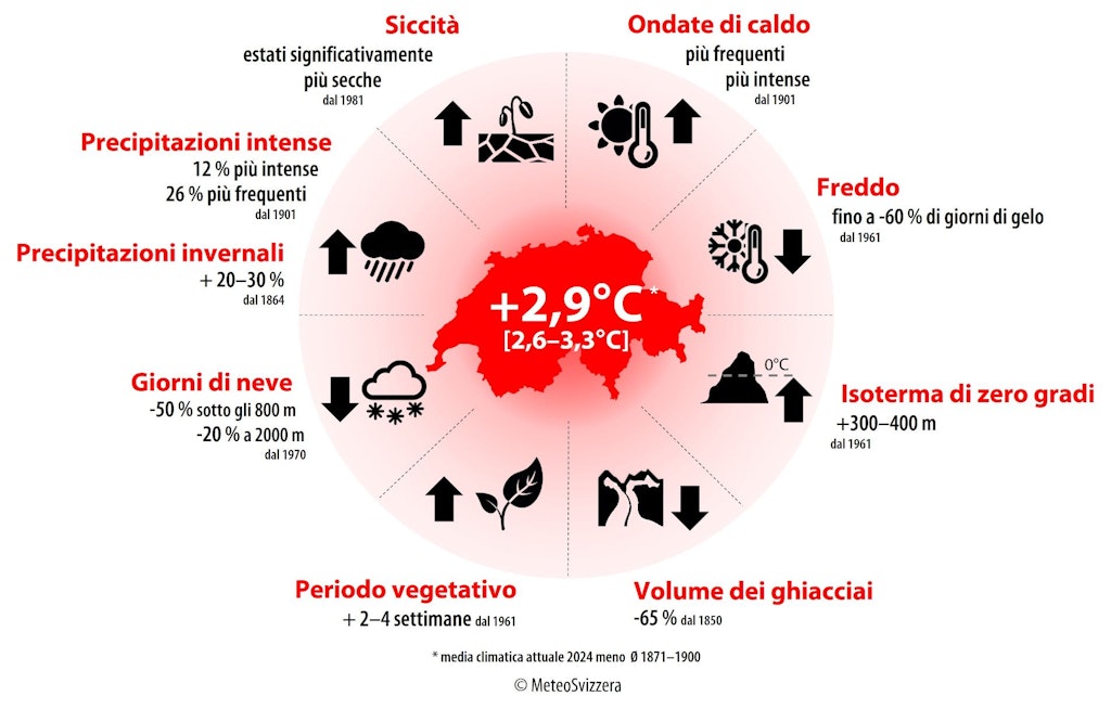 Con i cambiamenti climatici, in Svizzera aumenta anche il rischio di ondate di calore, siccità estiva e forti precipitazioni.