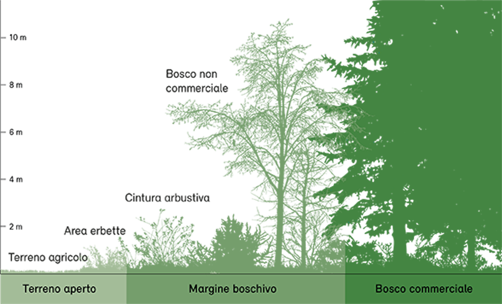 Li vediamo già da lontano: gigantesche conifere e latifoglie che estendono la loro chioma al cielo. Aguzzando le orecchie, sentirete ovunque fruscii, cinguettii di uccelli e ronzii. Molti animali e piante sono di casa ai margini del bosco. Qui possono riscaldarsi al sole e nascondersi rapidamente in caso di emergenza. Più naturale è il passaggio tra bosco e terreno aperto, meglio è.