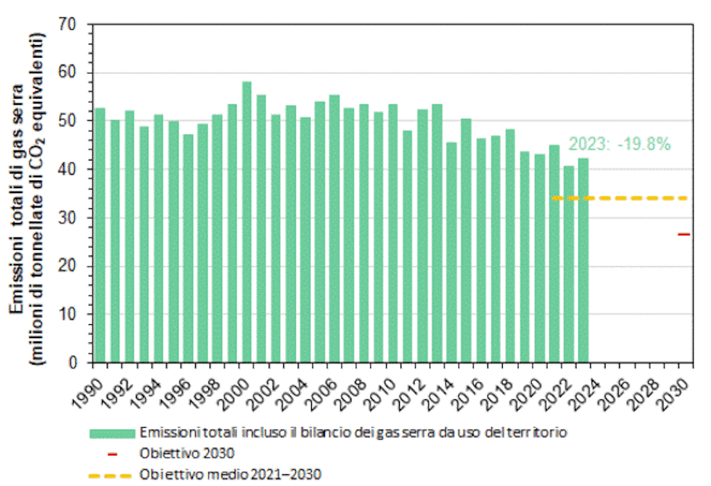 Il grafico seguente mette a confronto le emissioni totali di gas serra della Svizzera con gli obiettivi fissati per gli anni 2021–2030. Le misure adottate all’estero non sono ancora state prese in considerazione.
