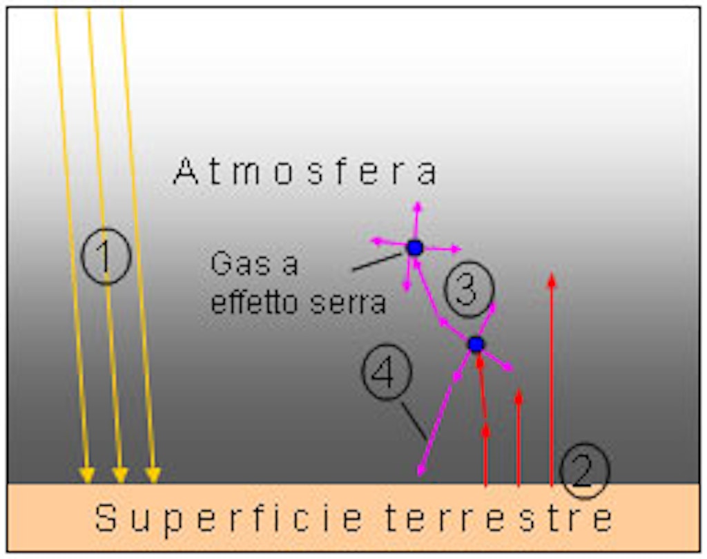 La radiazione solare viene assorbita dalla superficie terrestre. La superficie terrestre emette a sua volta radiazioni termiche nell’atmosfera. I gas serra presenti nell'atmosfera assorbono queste radiazioni rimandandone indietro una parte. Questo contribuisce al riscaldamento della superficie terrestre e dello strato più basso dell'atmosfera. Più aumenta la concentrazione dei gas serra, più si accentua il riscaldamento terrestre.