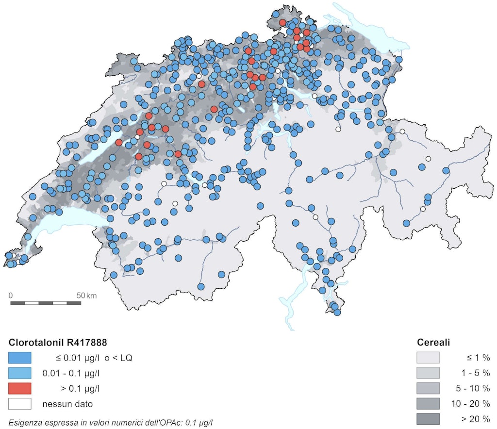 In complesso, sette metaboliti del clorotalonil sono stati rilevati nelle acque sotterranee in concentrazioni superiori a 0,1 microgrammi per litro: clorotalonil R471811, R417888, R419492, R611968, SYN 507900, SYN 548008 und SYN 548580. In particolare, i due metaboliti R471811 e R417888 inquinano le acque sotterranee su vasta scala in molte zone agricole dell’Altipiano. Dai dati raccolti, nei Cantoni AG, BE, BS, FR, GR, JU, LU, NE, SG, SH, SO, TG, TI, VD, VS, ZG e ZH risultano valori superiori a 0,1 microgrammi per litro.