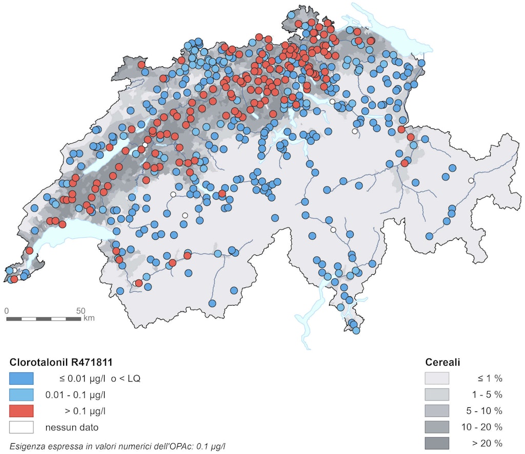 In complesso, cinque metaboliti del clorotalonil sono presenti nelle acque sotterranee in concentrazioni superiori a 0,1 microgrammi per litro: clorotalonil R471811, clorotalonil R417888, clorotalonil R419492, clorotalonil SYN 507900 und clorotalonil R548580. In particolare, i due metaboliti R471811 e R417888 inquinano le acque sotterranee su vasta scala in molte zone agricole dell’Altipiano. Dai dati raccolti, nei Cantoni AG, BE, FR, GE, GR, JU, LU, NE, SG, SH, SO, TG, VD, VS, ZG e ZH risultano valori superiori a 0,1 microgrammi per litro.