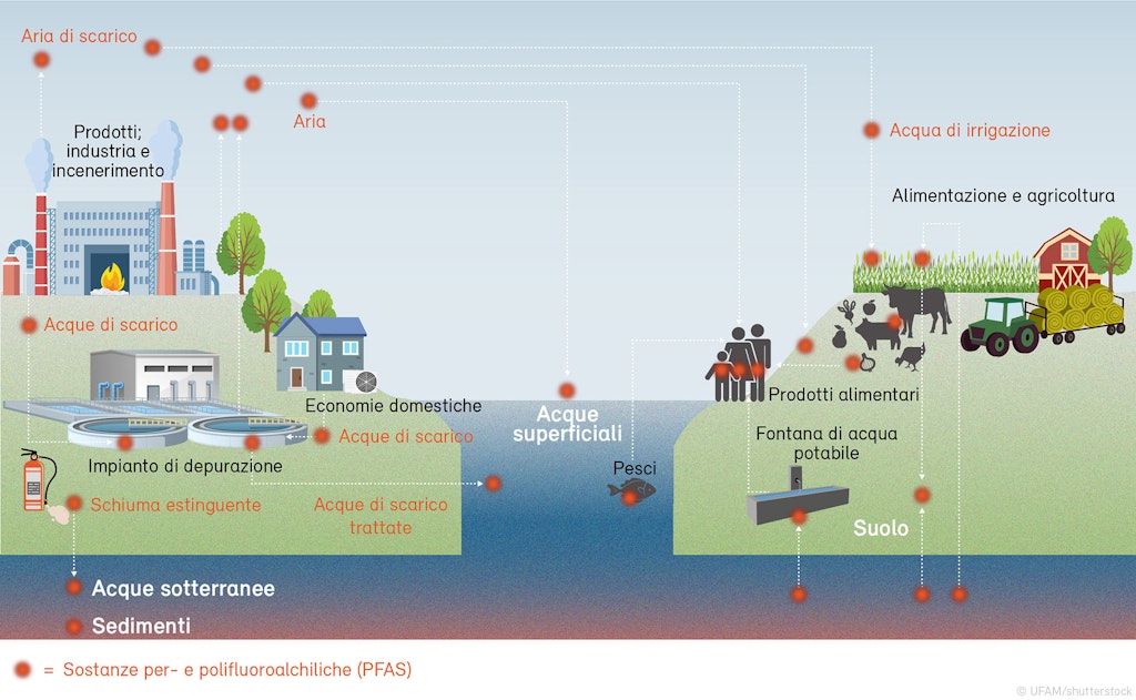 Numerose PFAS sono assorbite facilmente dagli organismi e sono presenti praticamente ovunque nell’ambiente. Le PFAS possono finire nell’ambiente già durante la loro produzione o la fabbricazione di prodotti che le contengono. Possono tuttavia essere rilasciate anche al momento dell’utilizzo o dello smaltimento di questi prodotti. L’uso di schiume estinguenti contenenti fluoro, in particolare, causa concentrazioni elevate di PFAS nell’ambiente.