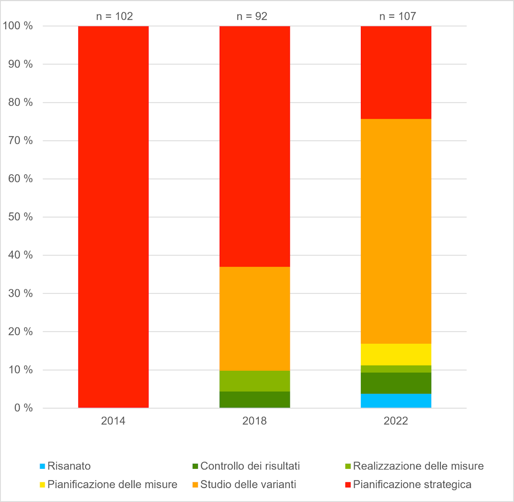 Il numero di misure attuate ogni anno è diminuito rispetto al periodo di attuazione 2014–2018. Tuttavia, a fine 2022 i risanamenti sono iniziati in circa tre quarti degli impianti segnalati.