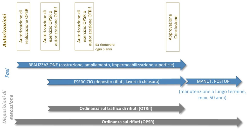 Le fasi di una discarica (realizzazione, esercizio e manutenzione postoperativa) sono disciplinate nell’ordinanza sui rifiuti (OPSR, RS 814.600). Il gestore di una discarica che, nella sua funzione di azienda di smaltimento, riceve rifiuti speciali oaltri rifiuti soggetti a controllo deve disporre di una relativa autorizzazione secondo l’ordinanza sul traffico di rifiuti (OTRif, RS 814.610).