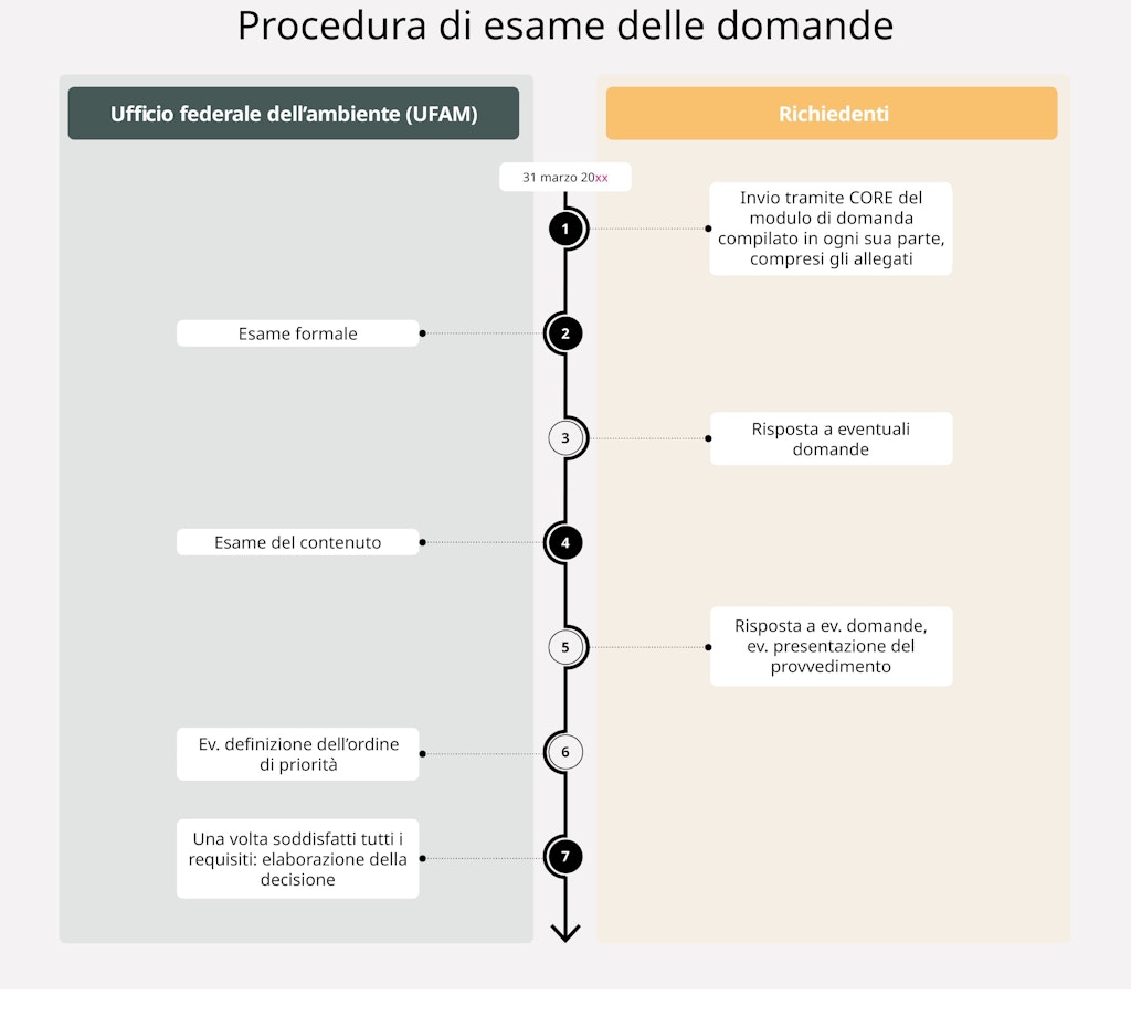 - Se le domande presentate per giorno di riferimento superano i mezzi disponibili per il rispettivo anno civile, tutte le domande che soddisfano i criteri formali e di contenuto sono valutate in base ai criteri di priorità ai sensi dell’articolo 127l dell’ordinanza sul CO₂.
