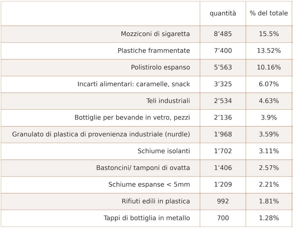 E, in particolare, dove? Solo lungo i corsi d’acqua sono stati raccolti e documentati in totale 54 744 oggetti. Per quanto concerne i rifiuti più diffusi, il primo in classifica sono indubbiamente i filtri di sigaretta. I volontari ne hanno raccolti 8485 pezzi. Al secondo e al terzo posto seguono poi i frammenti di plastica (7400 pezzi) e di polistirolo (5563 pezzi). L’elenco prosegue con confezioni in plastica di dolciumi e snack (3325 pezzi), come ad esempio le barrette di cioccolato. Al quinto e al sesto posto si trovano invece pellicole industriali in plastica (2534 pezzi) e frammenti di bottiglie in vetro (2136 pezzi). I posti dal settimo al decimo sono occupati da granulati di plastica di origine industriale (1968 pezzi), schiume isolanti (1702 pezzi), bastoncini di ovatta (1406 pezzi) e materiali espansi (1209 pezzi). Sono inoltre presenti rifiuti edili in plastica (992 pezzi) e tappi in metallo per bottiglie (700 pezzi).