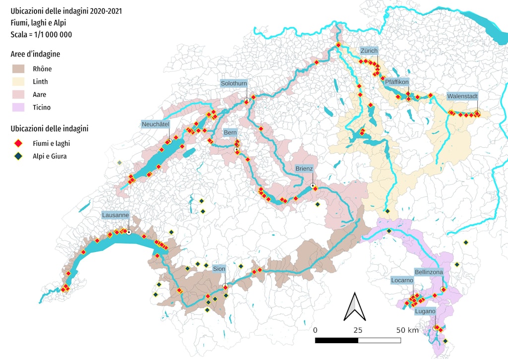 Tra i mesi di marzo 2020 e maggio 2021, decine di volontari hanno setacciato 143 rive di laghi e fiumi in diverse zone del Paese, raccogliendo tutti i rifiuti visibili a occhio nudo e catalogandoli in base a un sistema di codici dettagliato. In particolare, sono stati analizzati tratti di rive in quattro aree di rilevamento presso i fiumi Aare, Rodano, Ticino e Limmat e presso alcuni laghi e affluenti di questi bacini. In dodici località di sette grandi laghi sono stati eseguiti rilevamenti mensili: lago di Zurigo, lago Lemano, lago di Bienne, lago di Neuchâtel, lago Maggiore, lago di Thun e lago di Walenstadt.
