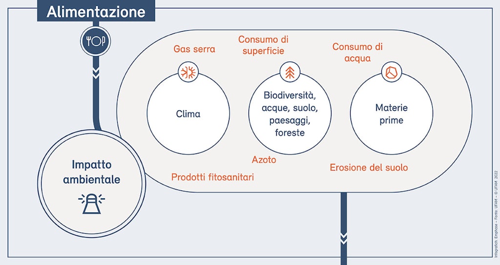 Cibo è sinonimo di piacere, identità e tradizione. La produzione agricola, la trasformazione industriale delle derrate alimentari, nonché il loro imballaggio, la loro distribuzione, la loro preparazione e il loro consumo incidono sull’ambiente, sia a livello locale che globale. Tra i problemi principali figurano le emissioni di gas serra, l’apporto di azoto, fertilizzanti e prodotti fitosanitari, come pure il consumo di suolo.