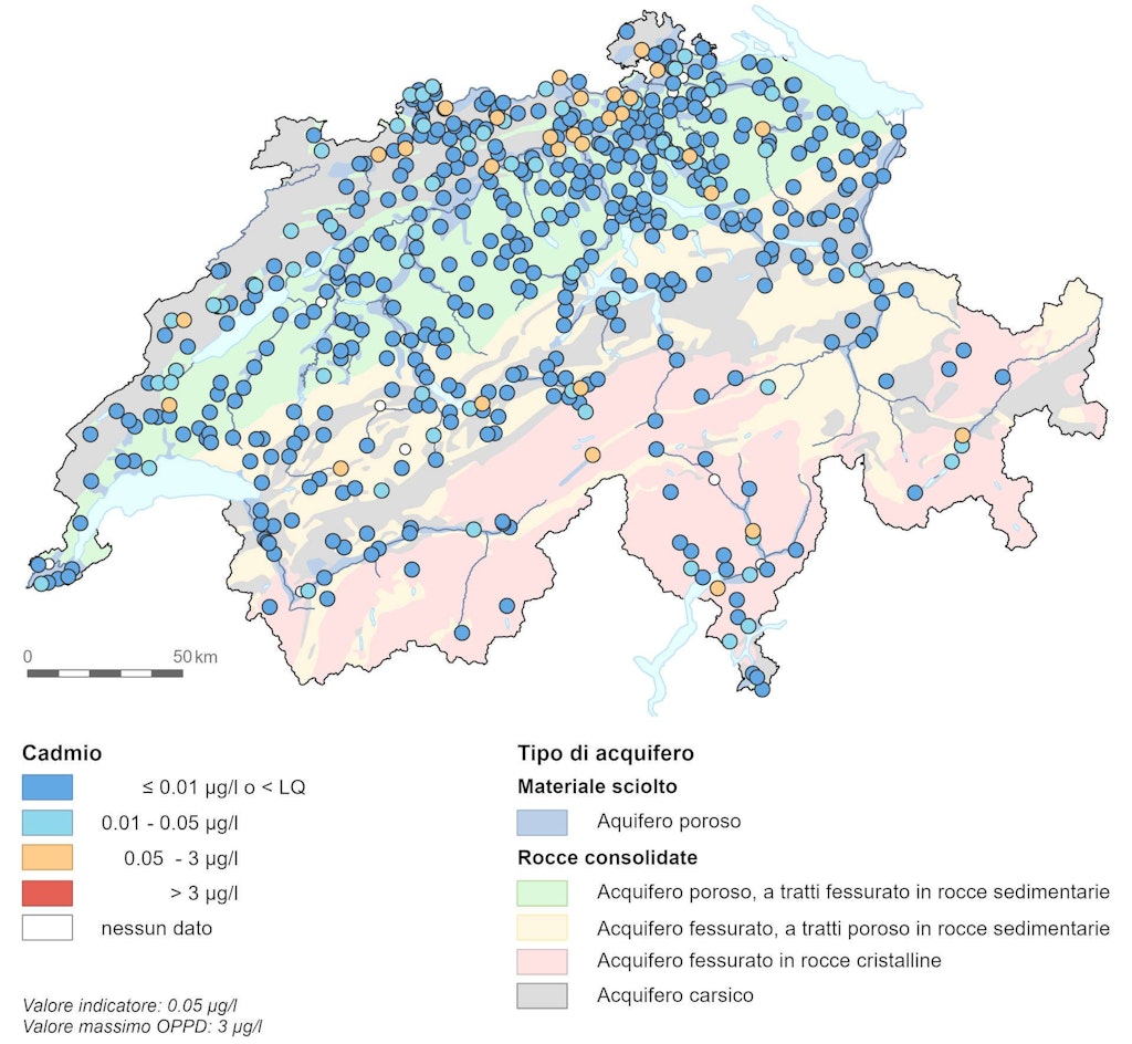 Nell’80 per cento delle stazioni di misurazione, le concentrazioni di cadmio sono generalmente inferiori al limite di quantificazione di 0.01 µg/l. Il valore massimo di 3 µg/l previsto dall’OPPD per l’acqua potabile non viene superato in nessuna stazione di misurazione. Le stazioni di misurazione in cui sono rilevate concentrazioni superiori al valore indicativo definito nelle Istruzioni pratiche per la protezione delle acque sotterranee si trovano principalmente nella parte orientale del Giura e nell’Altopiano. Singole concentrazioni elevate sono rilevate nelle stazioni di misurazione nelle Prealpi, nelle Alpi e a Sud delle Alpi. Oltre il 35 per cento delle stazioni di misurazione che rilevano concentrazioni superiori al valore indicativo definito nelle Istruzioni pratiche per la protezione delle acque sotterranee si trova in un bacino idrografico a vocazione prevalentemente agricola.