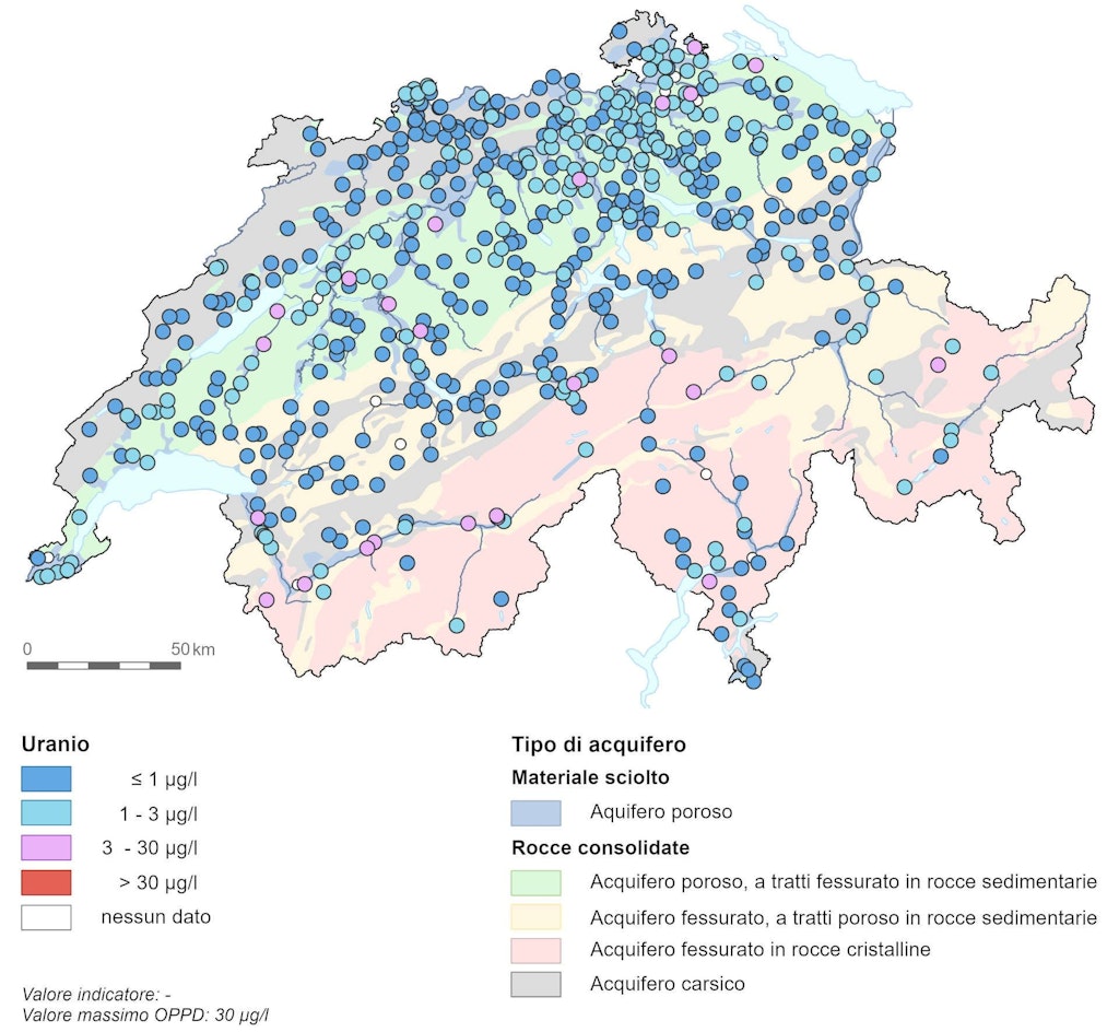 Le concentrazioni di uranio sono generalmente basse e inferiori a 3 µg/l. Il valore massimo di 30 µg/l previsto dall’OPPD per l’acqua potabile non viene superato in nessuna stazione di misurazione. Le concentrazioni tendono ad essere più elevate sull’Altopiano che nel Giura o nelle Prealpi. Sulla base dei dati non è possibile stabilire chiaramente se ciò sia dovuto all’uso di fertilizzanti fosfatici contenenti uranio o alla dissoluzione dell’uranio naturalmente presente nel suolo a seguito della coltivazione più intensiva dei terreni agricoli.